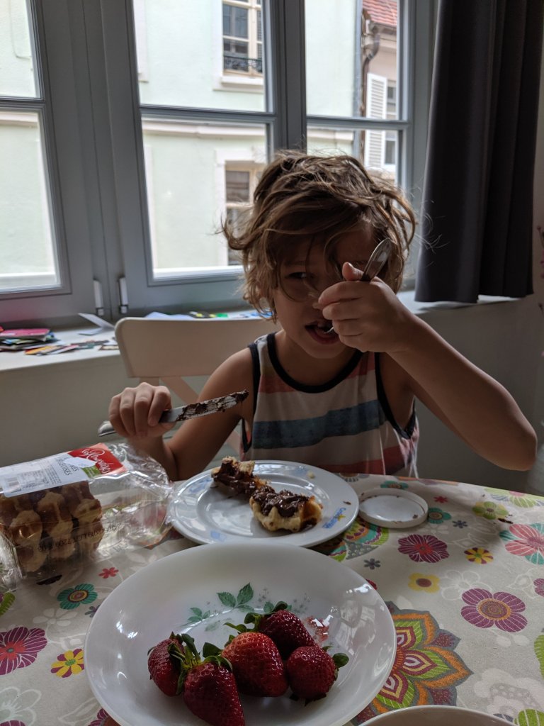 Asa and I went for a walk this morning to get more breakfast food. He likes these packaged, shelf stable waffles. I haven’t tried them but the texture seems weird. He puts Nutella on them. We also stopped for a baguette which has become a daily ritual for us. He can now say “bonjour”, order his baguette (une baguette s’il vous plaît) and then “merci”. He is going to try going to get the bread alone one day soon.