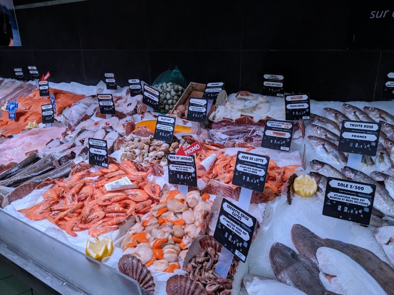 Later my mom and I walked to the store to get a few things. I lost my toiletries in the hotel in the UK so I needed to replace them. This seafood display caught our eyes since it had so many things we had never seen before. Lots of whole fish with the heads still on too.