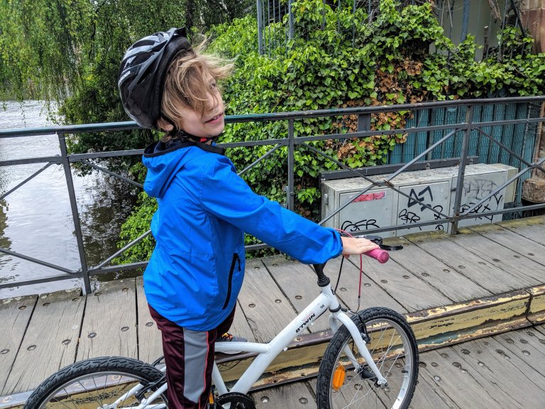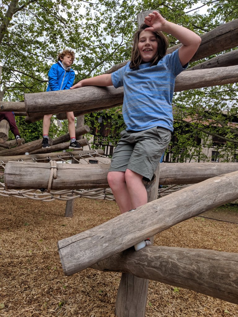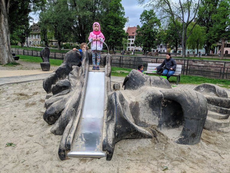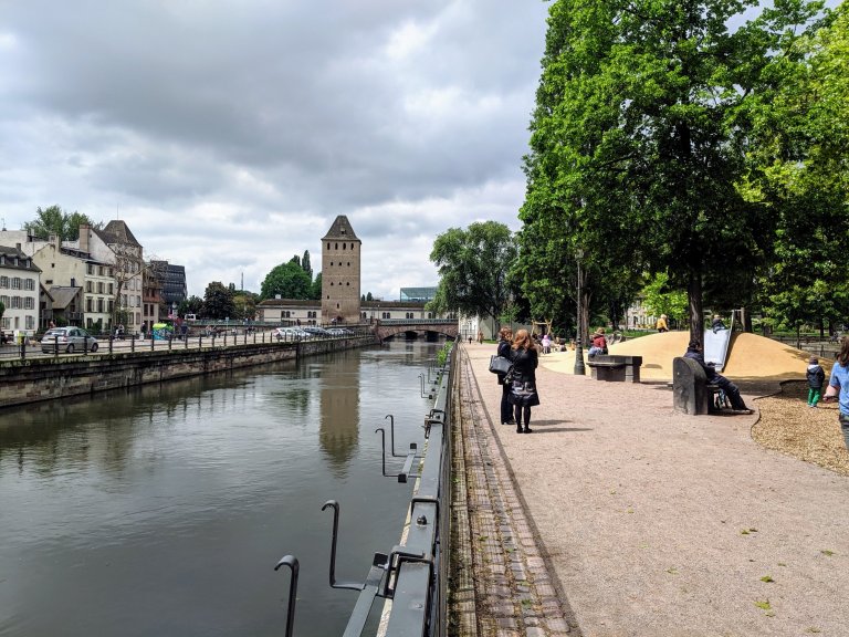 Neither my mom or I have rode a bike in a while and now we had to ride with a kid on the back. We ended up doing about a 45 minute tour of the edge of Petite France and stopped at a playground part way through.