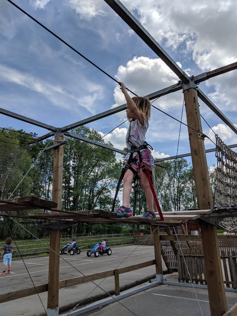 Then we went outside to see what was out there. They had pedal style go-karts and a couple of ropes courses. One for big kids and one for little kids. Esme loves these and she did both.