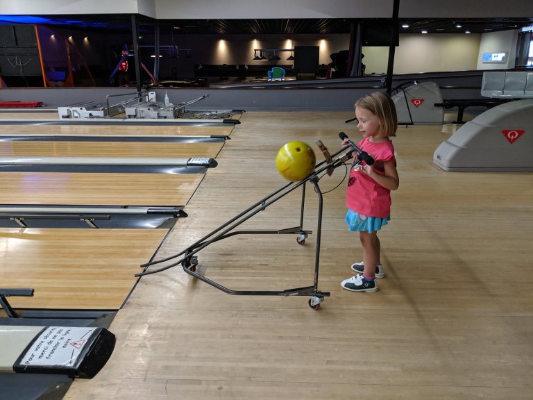 I really liked the bowling helpers they had. You set the ball on the top and the pull the bike brake to release it. It would have been nice to have the kind you push too but the kids liked the novelty of it.