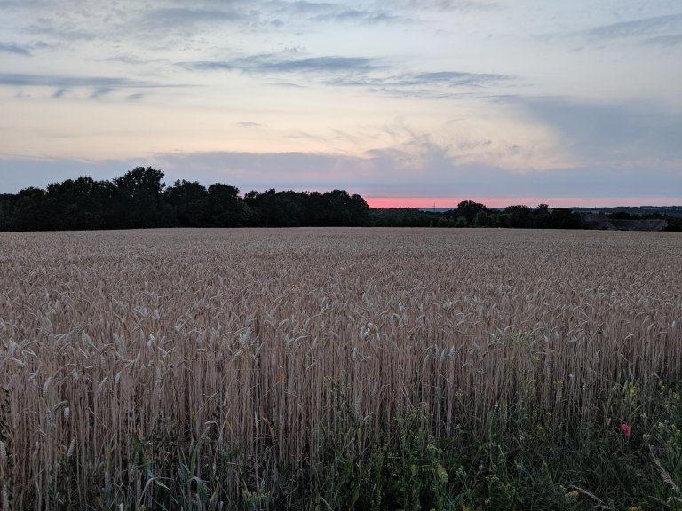 Once fed we were all a little jollier and relaxed. The rest of the ride was easy with hardly any traffic. We followed our GPS and were just 4 km from our destination when I underestimated the size of the van and bumped the tire on the curb in a narrow part of the road. As luck would have it, the tire went flat and we were on the roadside.A nice man named Oliver stopped to help us (mostly giving moral support and advice to Nole in French). Thanks to him and a lot of sweat from a very tired Nole (24 hours of travel with only 3 hours of sleep) the spare was on and we went the last 4 km to Remy’s house to meet his parents Laurence and Yannick. We chatted and relaxed and later the kids spent time in their pool while Nole snuck off for a shower and sleep. Remy made an appearance but was up until the wee hours this morning celebrating a friend’s birthday and ended up going back to bed too. Cal and I went for a walk in the neighborhood with our hosts. We found a scarab, badger poop, wild herbs and took in the sunset behind a wheat field.