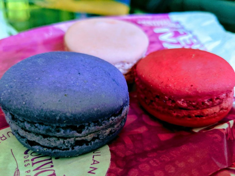 Macarons in raspberry, rose, and violet flavors.