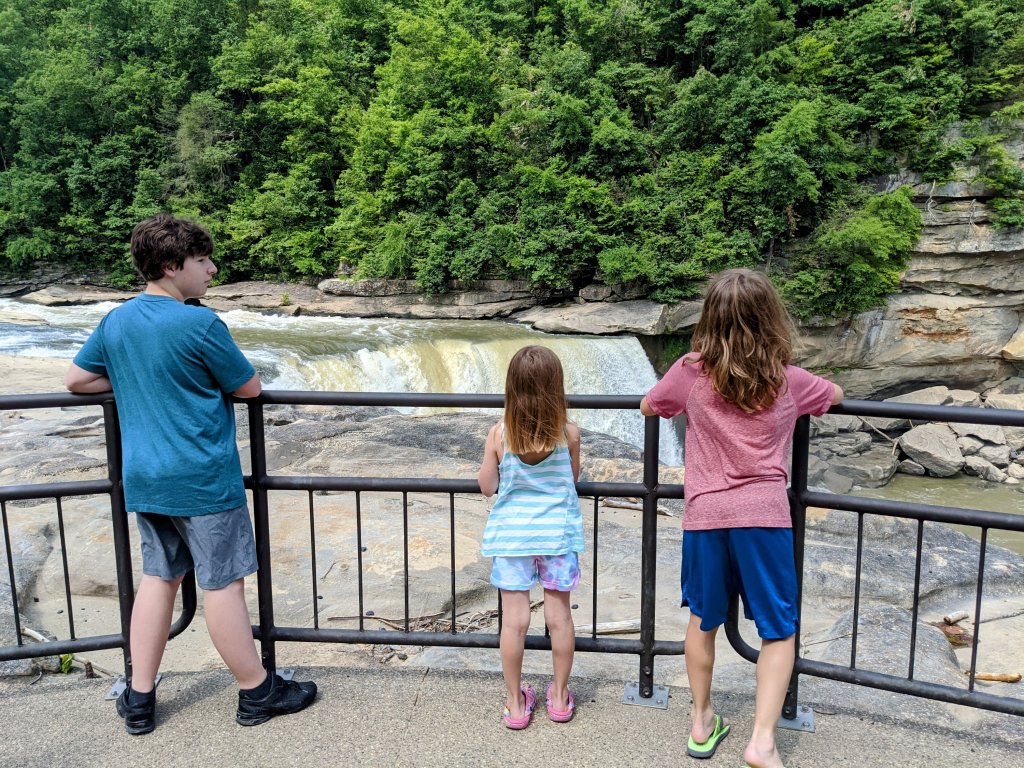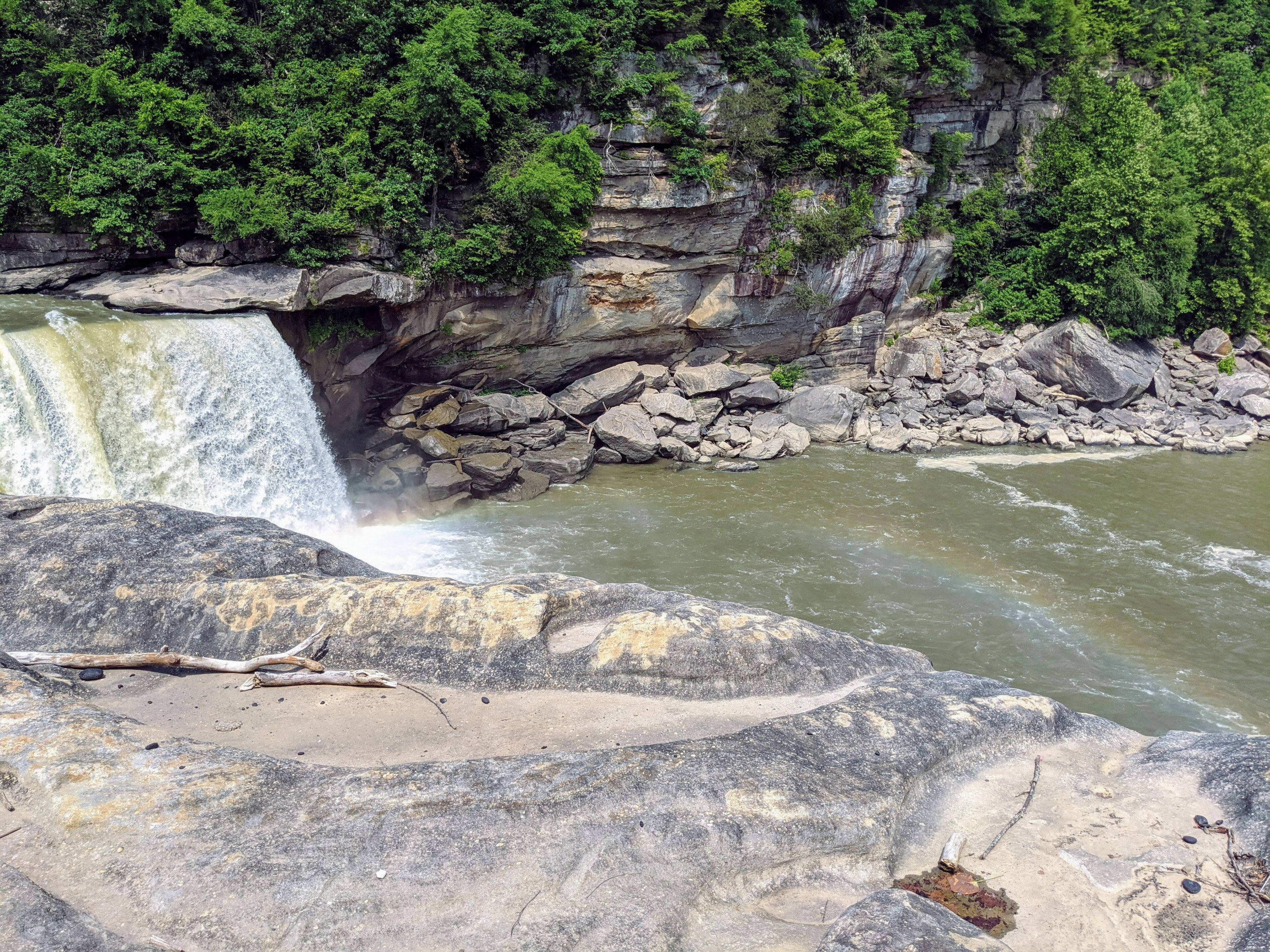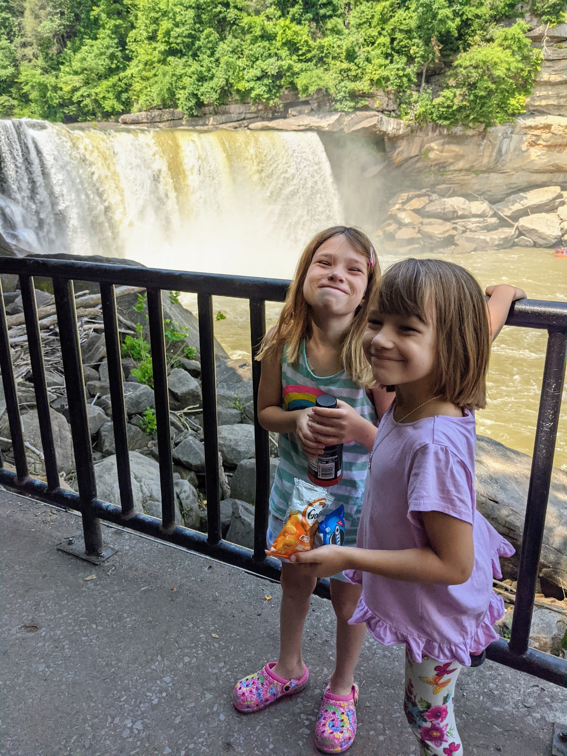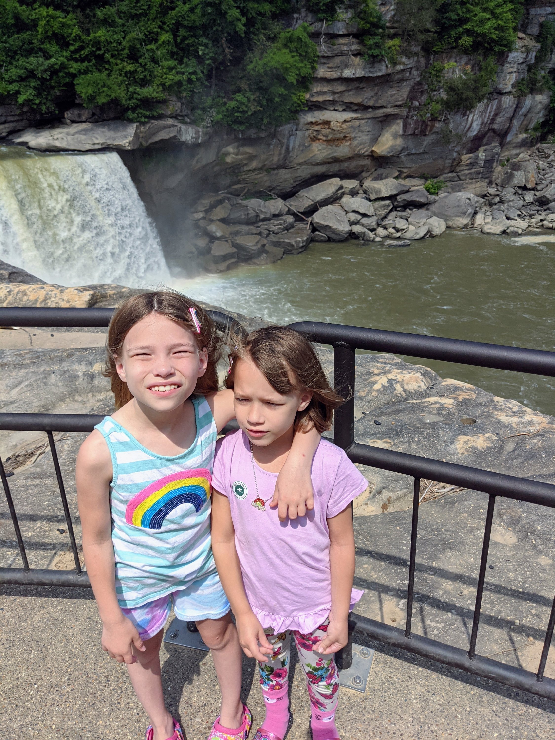 Cal had a Zoom interview this morning (he got the job!) and we left the hotel in Lexington for Tennessee. We stopped at Cumberland Falls first. There was a rainbow over the falls and the girls just happened to be wearing rainbows today so they matched the waterfall!