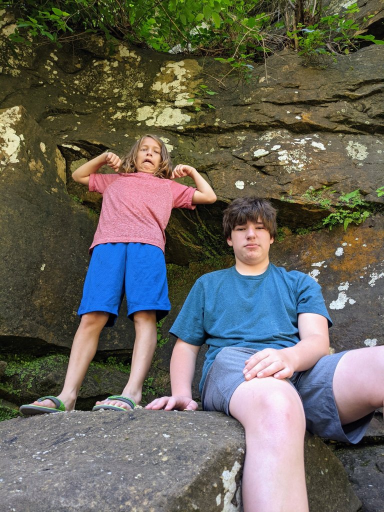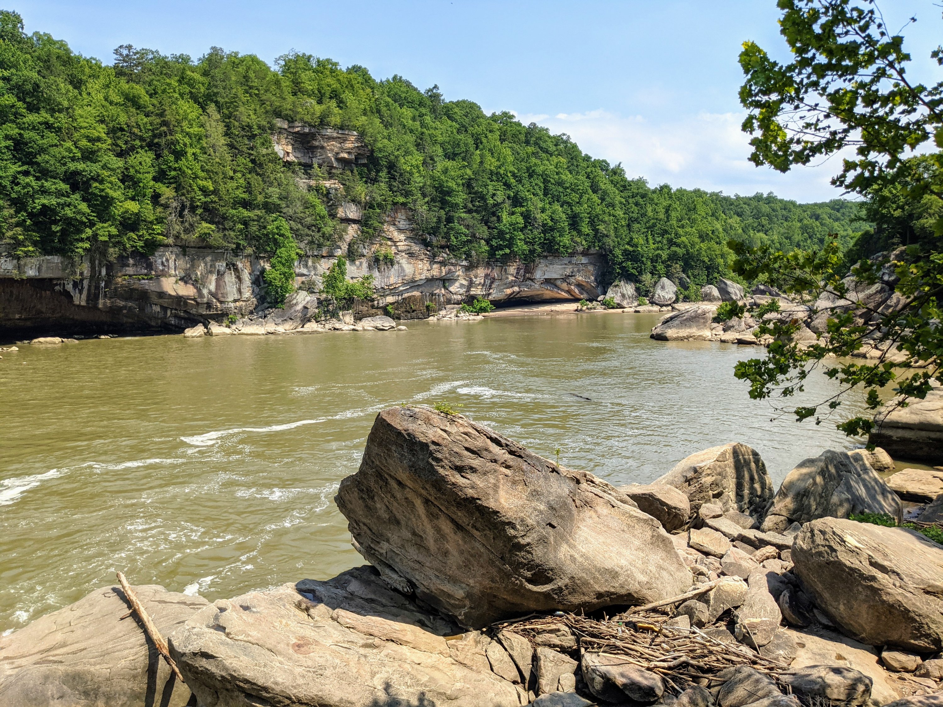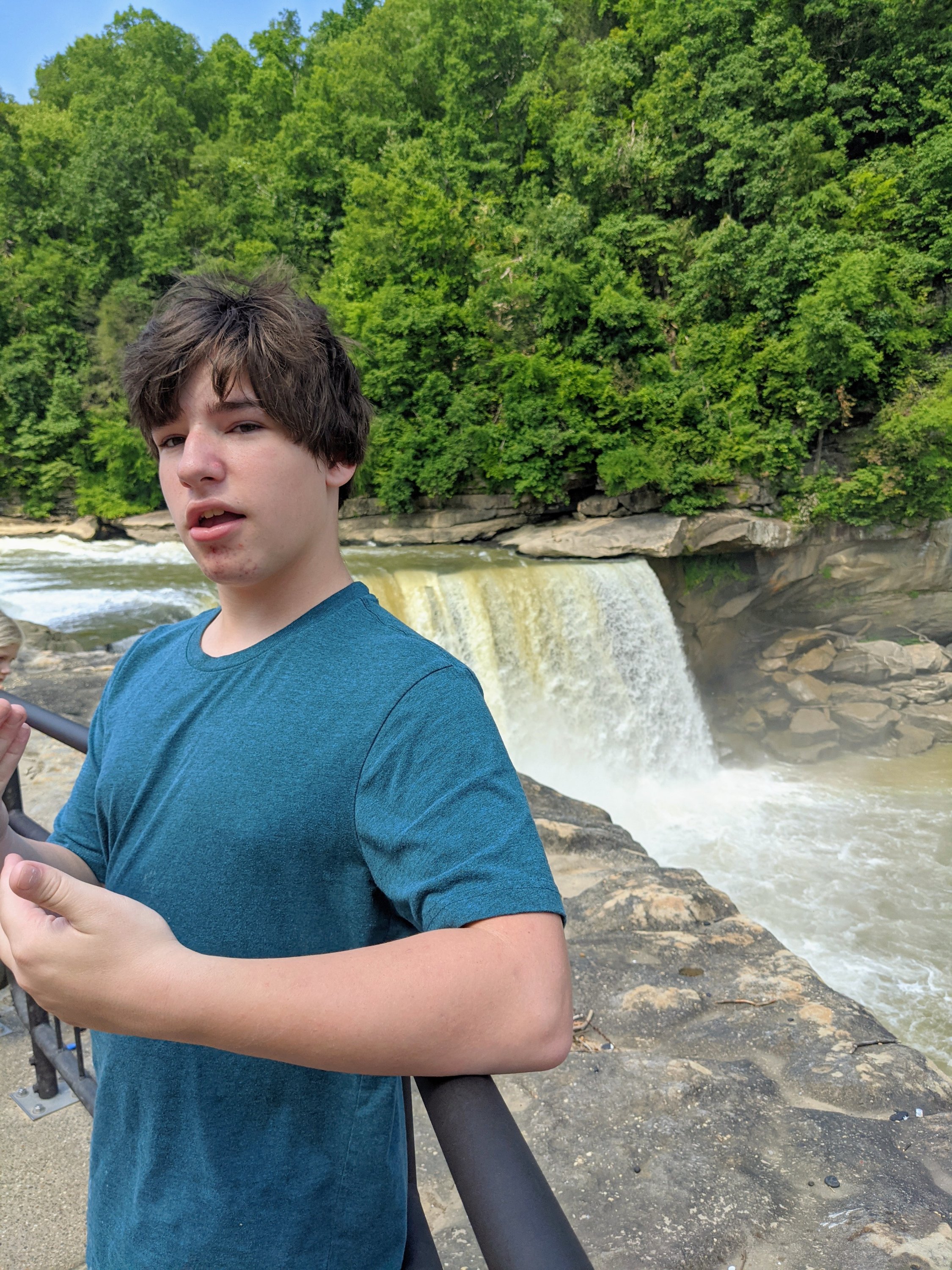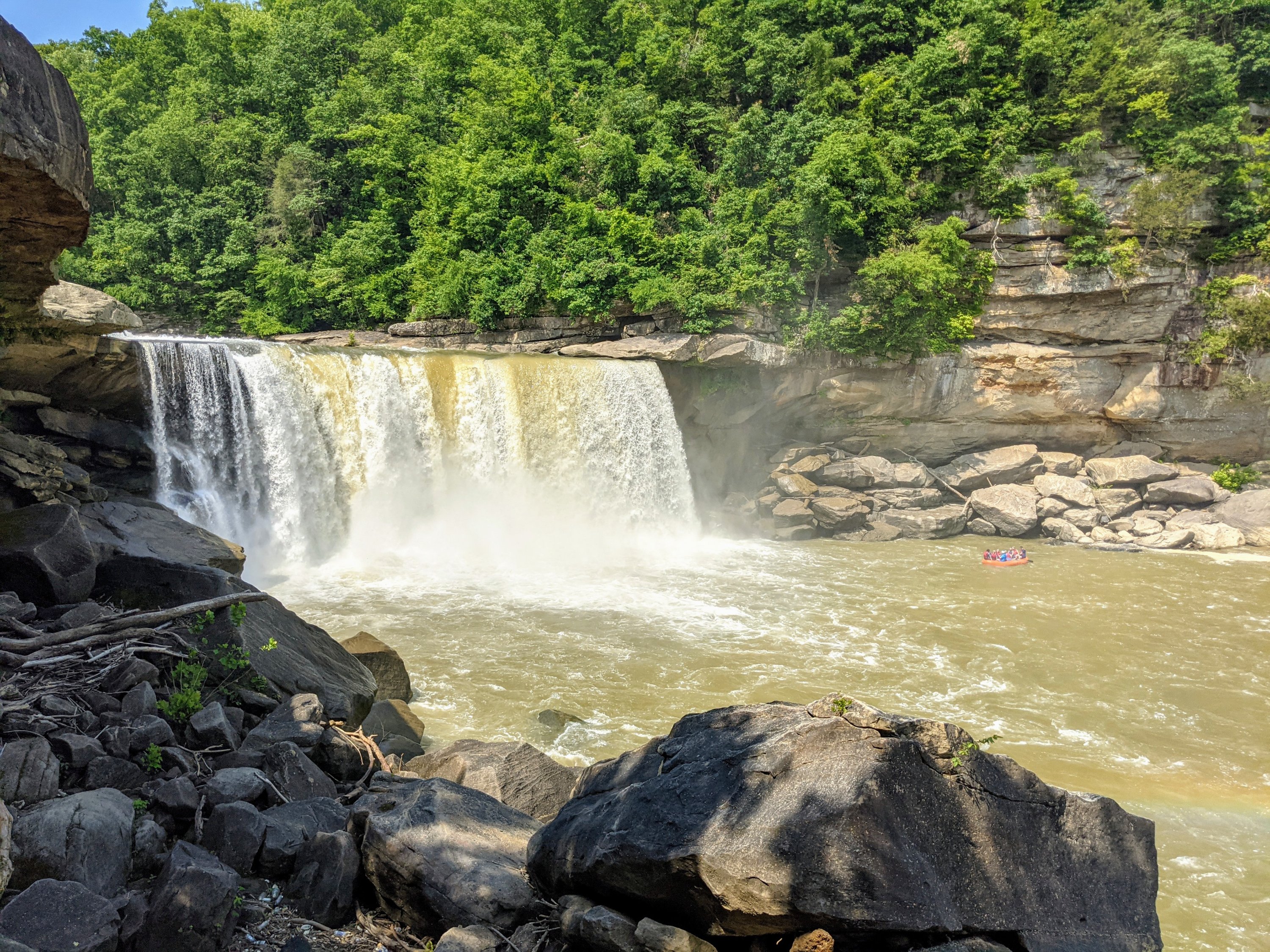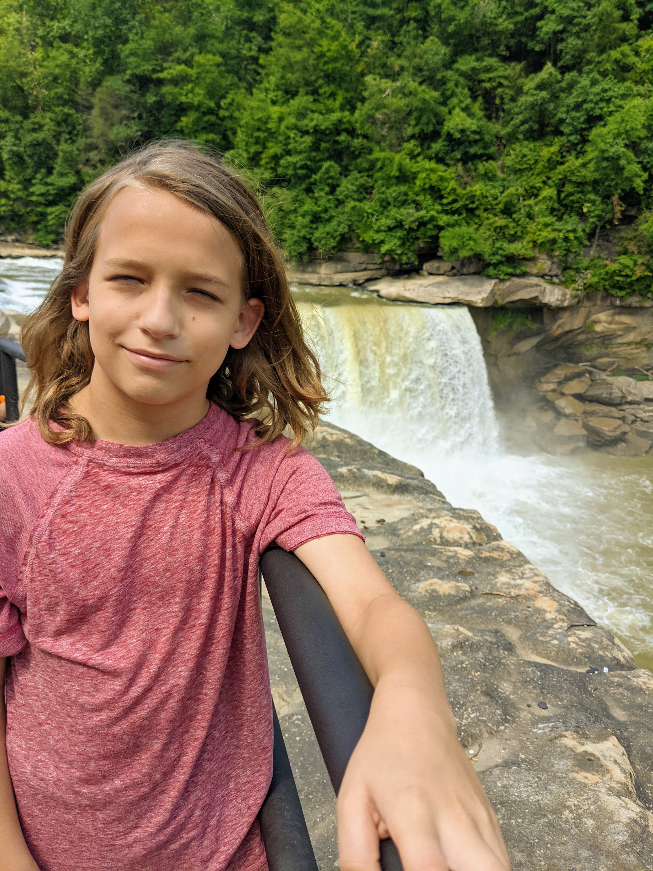 Cal had a Zoom interview this morning (he got the job!) and we left the hotel in Lexington for Tennessee. We stopped at Cumberland Falls first. There was a rainbow over the falls and the girls just happened to be wearing rainbows today so they matched the waterfall!