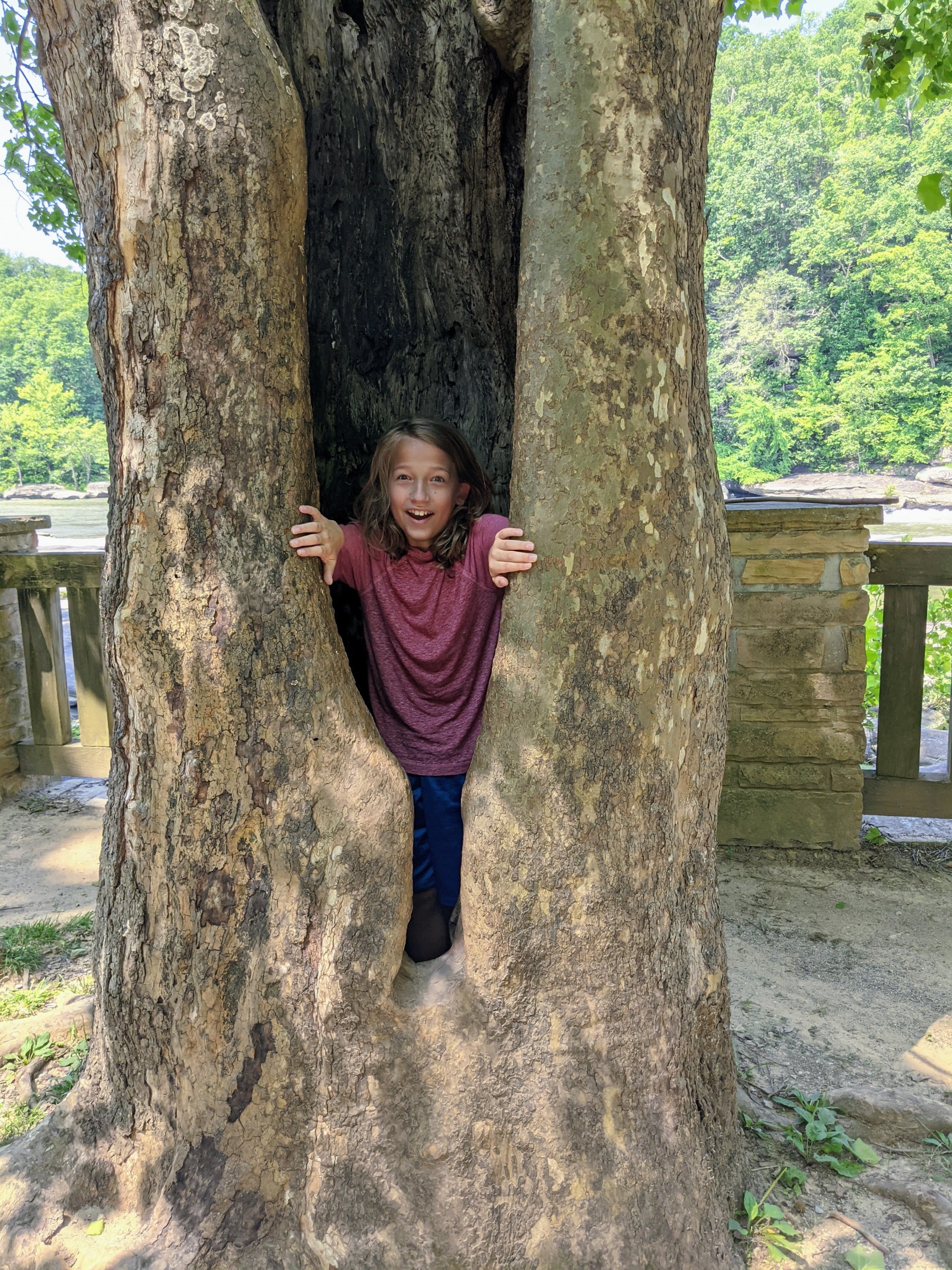 I made Asa go inside a hallowed out tree even though he said there were spiders in it.