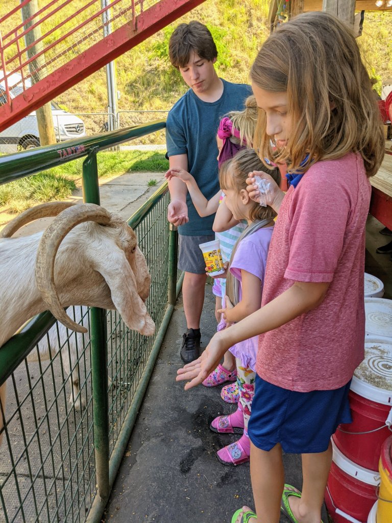 Then we went to Goats Coasters on the Roof in Pigeon Forge. This place is nestled right up to the Smokey Mountains. It’s a very touristy town like Wisconsin Dells. Dollywood is also in Pigeon Forge but we didn’t go there today. Maybe next time! The kids really want to go back there. Today we were just seeing the goats and passing through.