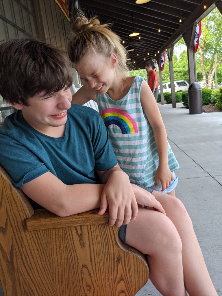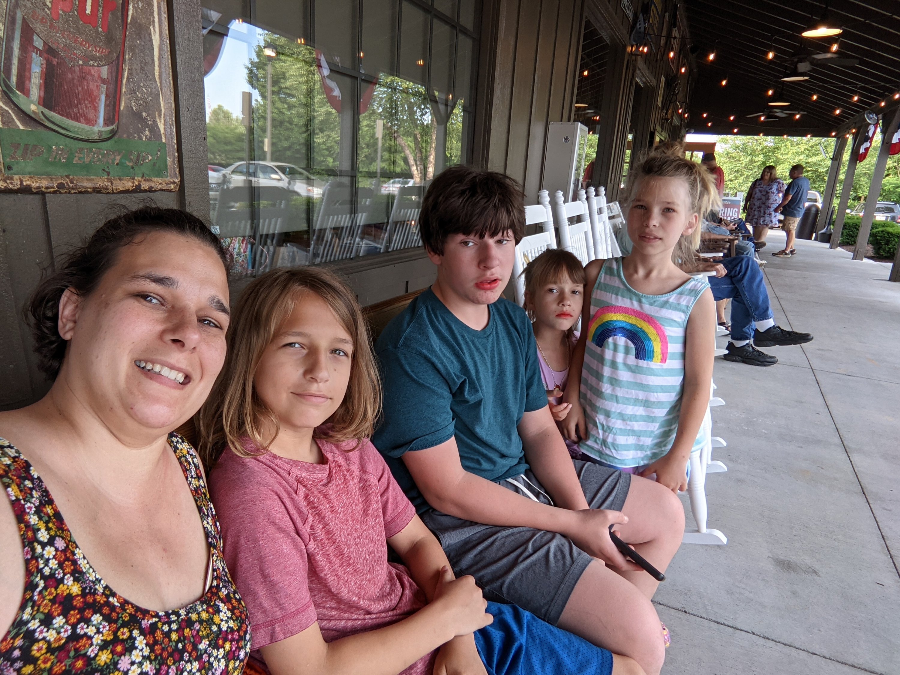We stopped at a Cracker Barrel for dinner and unfortunately it was pretty busy. We had to wait to be seated about 30 minutes. While we waited we played some games like follow the leader and telephone. Playing telephone turned out to be hilarious. The message didn’t make it through the 5 of us intact even once. Plus it turns out the girls are really bad a whispering in ears. Esme kept breathing really hard in our ears which tickled and made it hard to hear what she was saying.