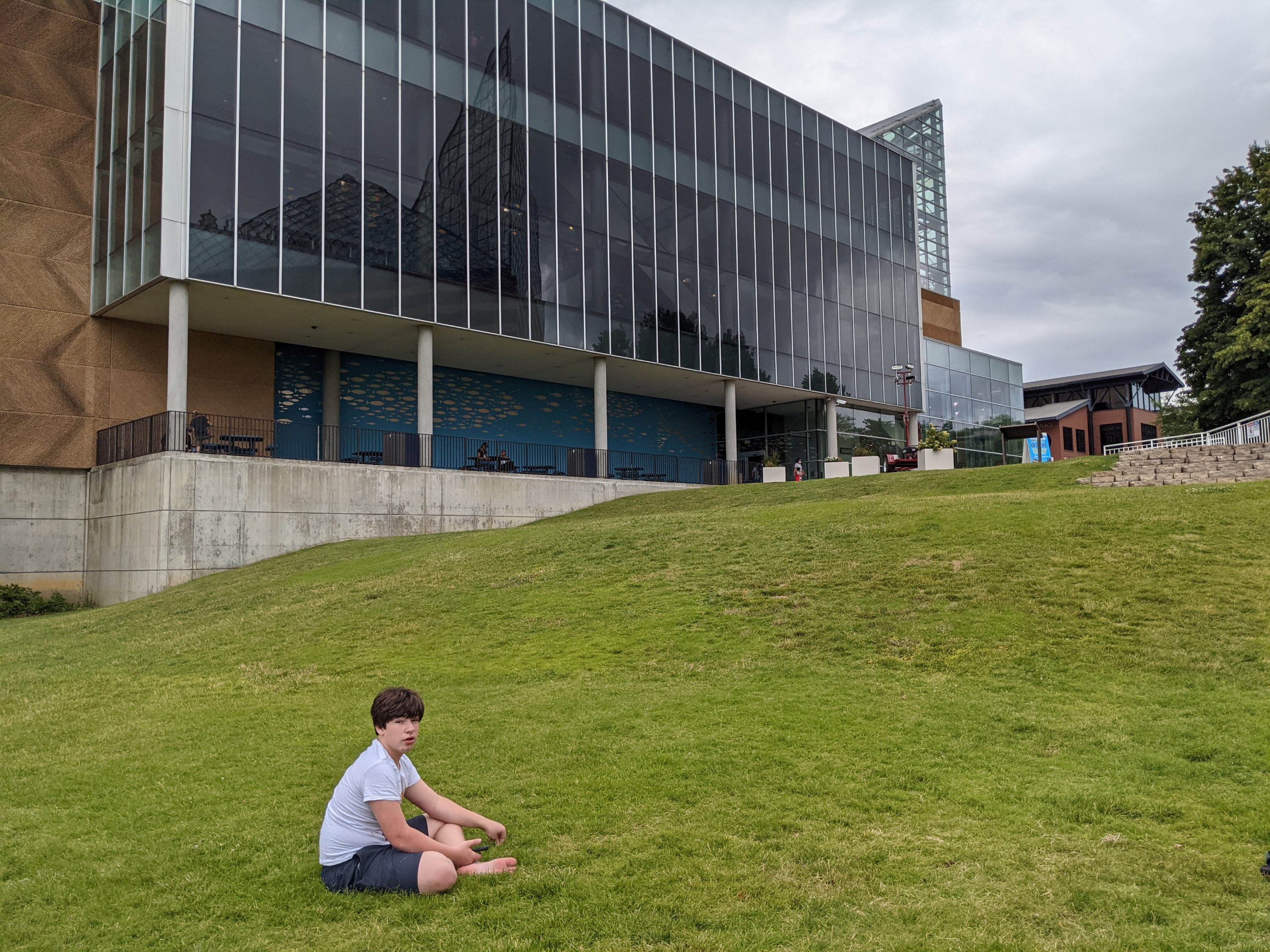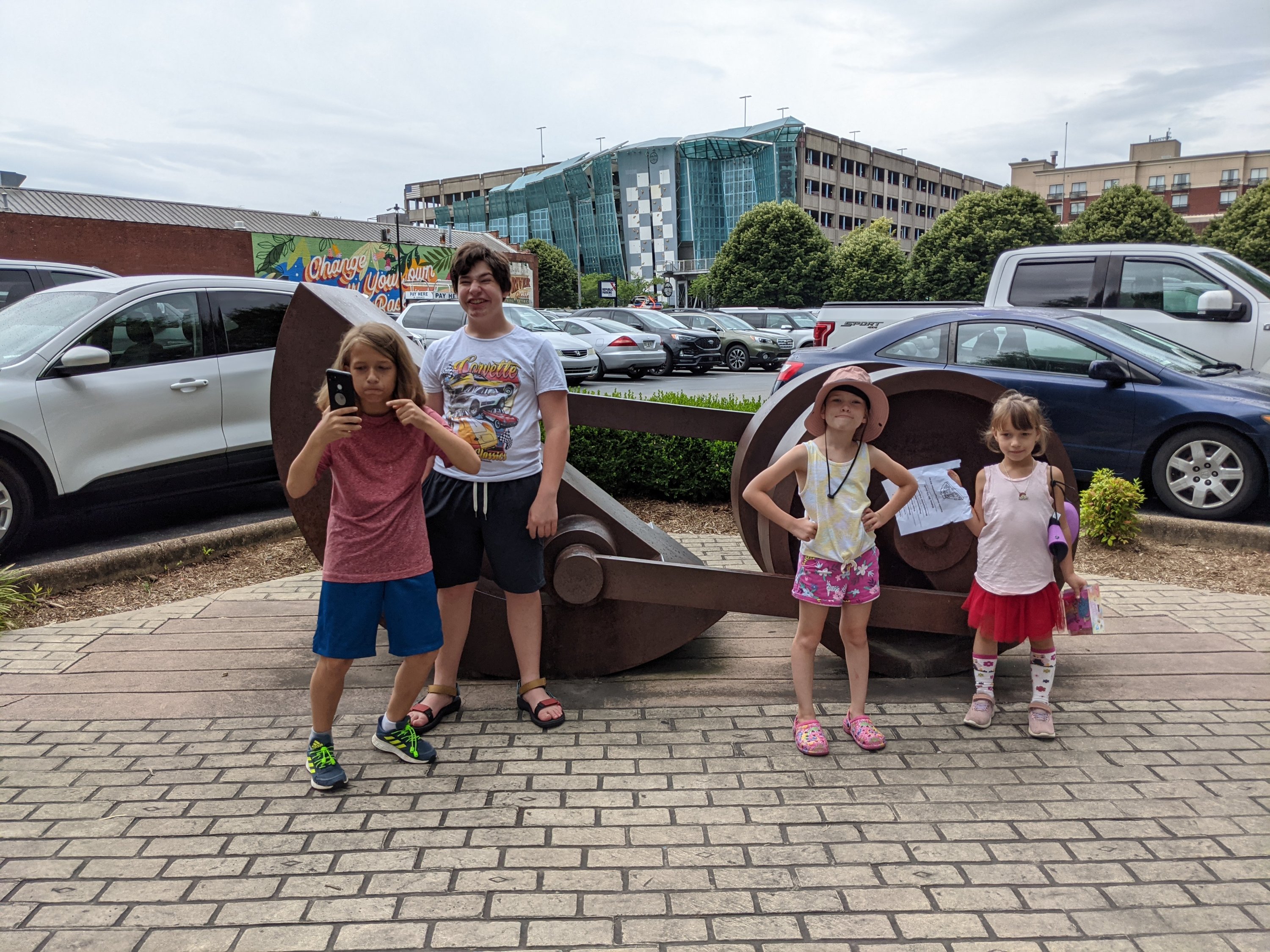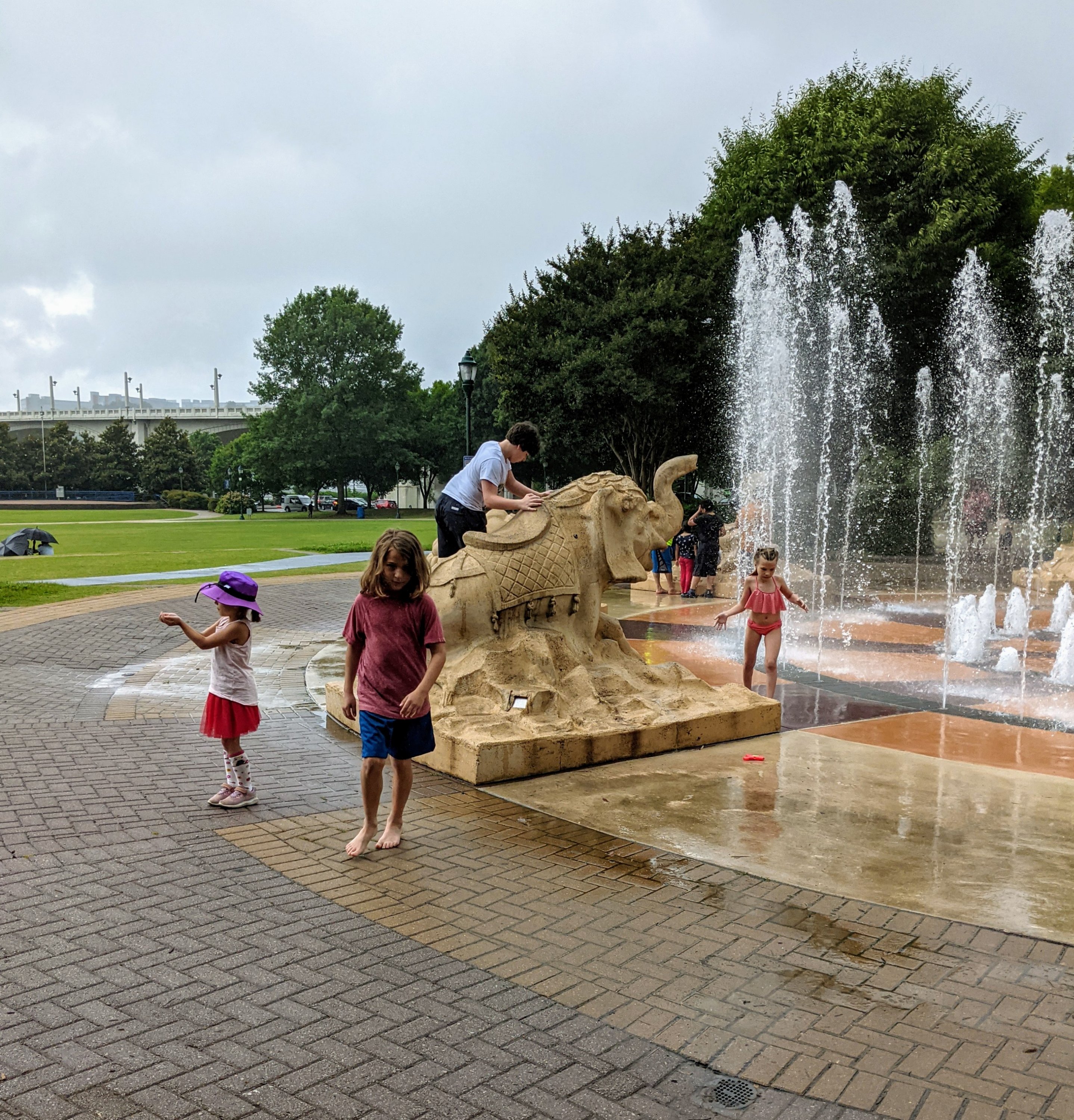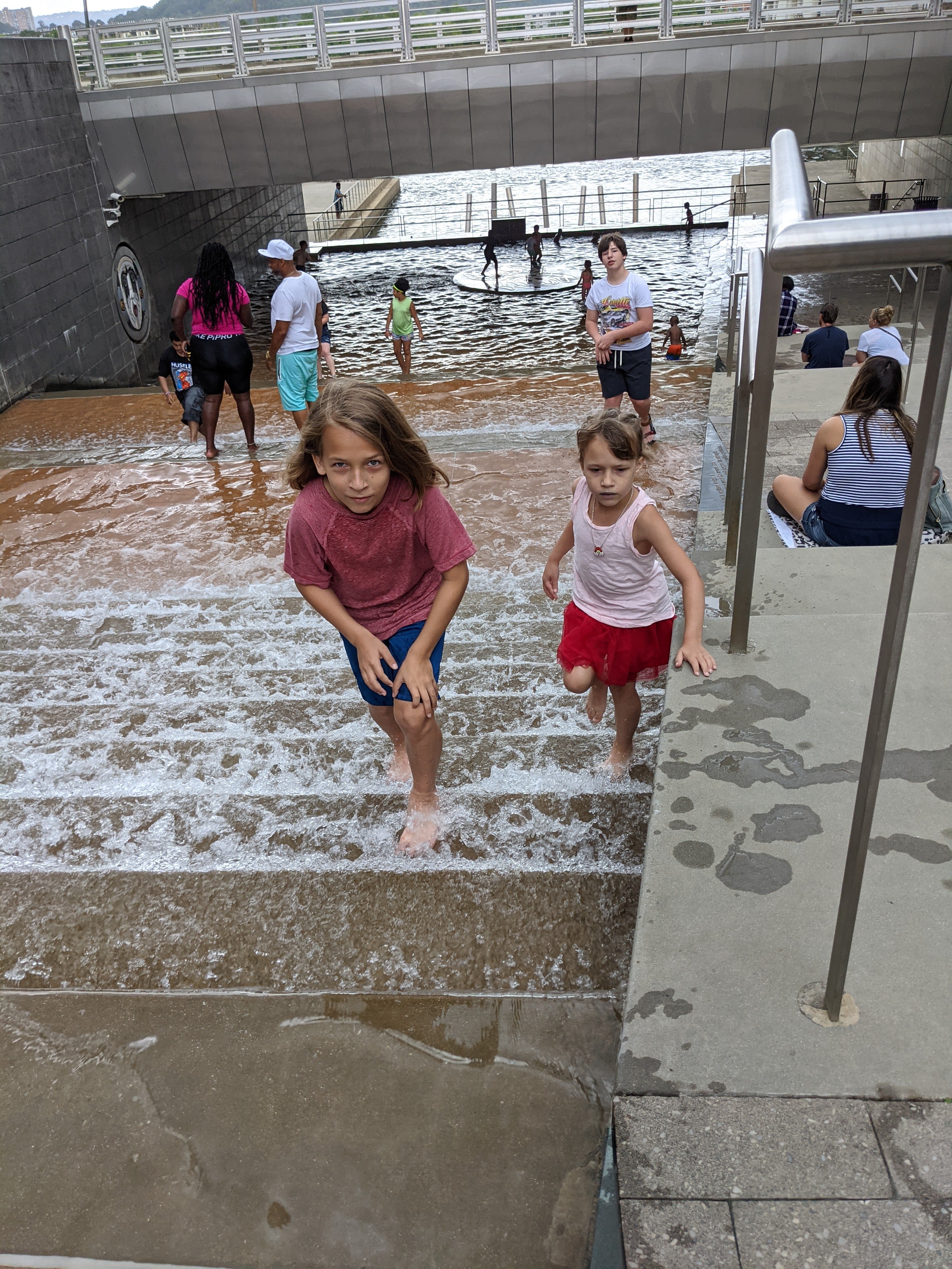 The kids were having a lot of fun and didn’t want to leave but I really wanted to check out Coolidge Park so we moved on. We crossed the Walnut Street Bridge which is a long wooden bridge for foot traffic and bikes. It was overcast and hot today. The clouds saved us from getting too hot as we walked around.