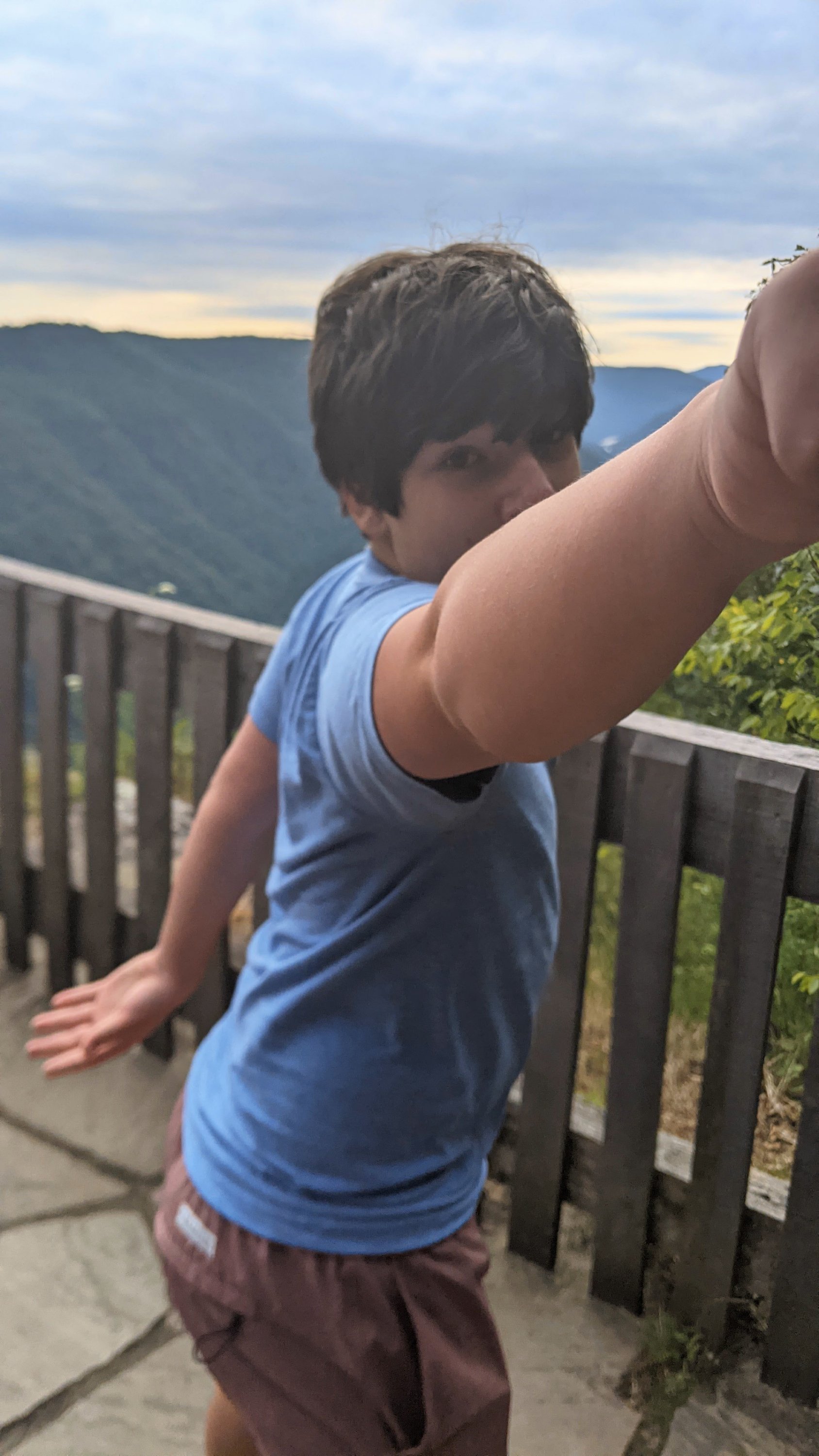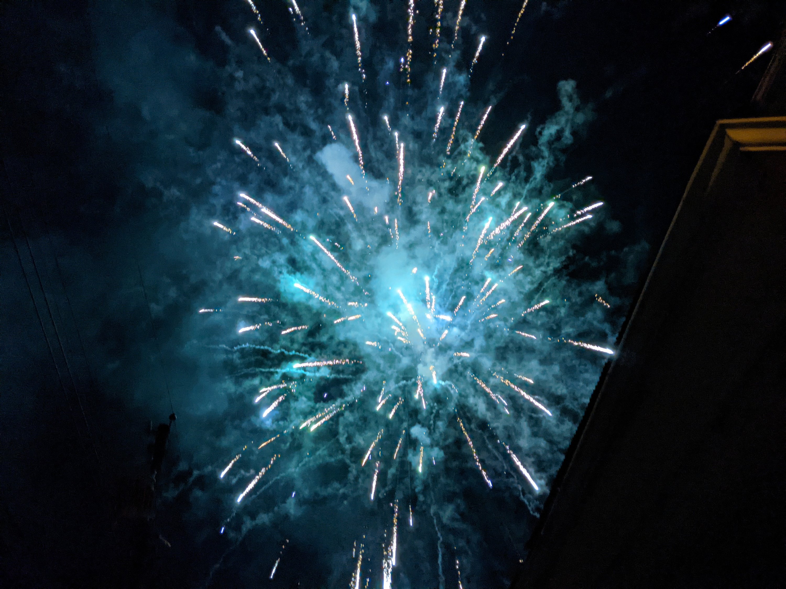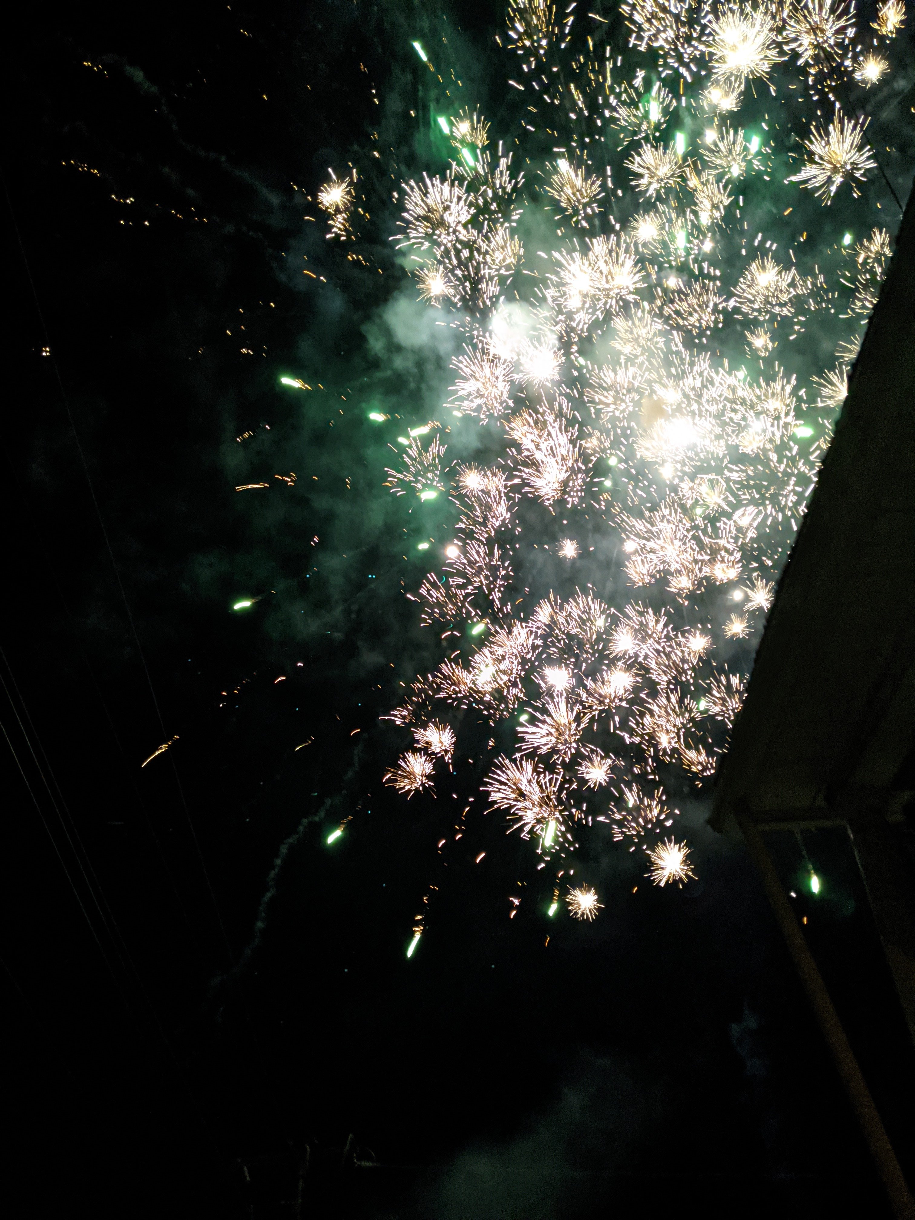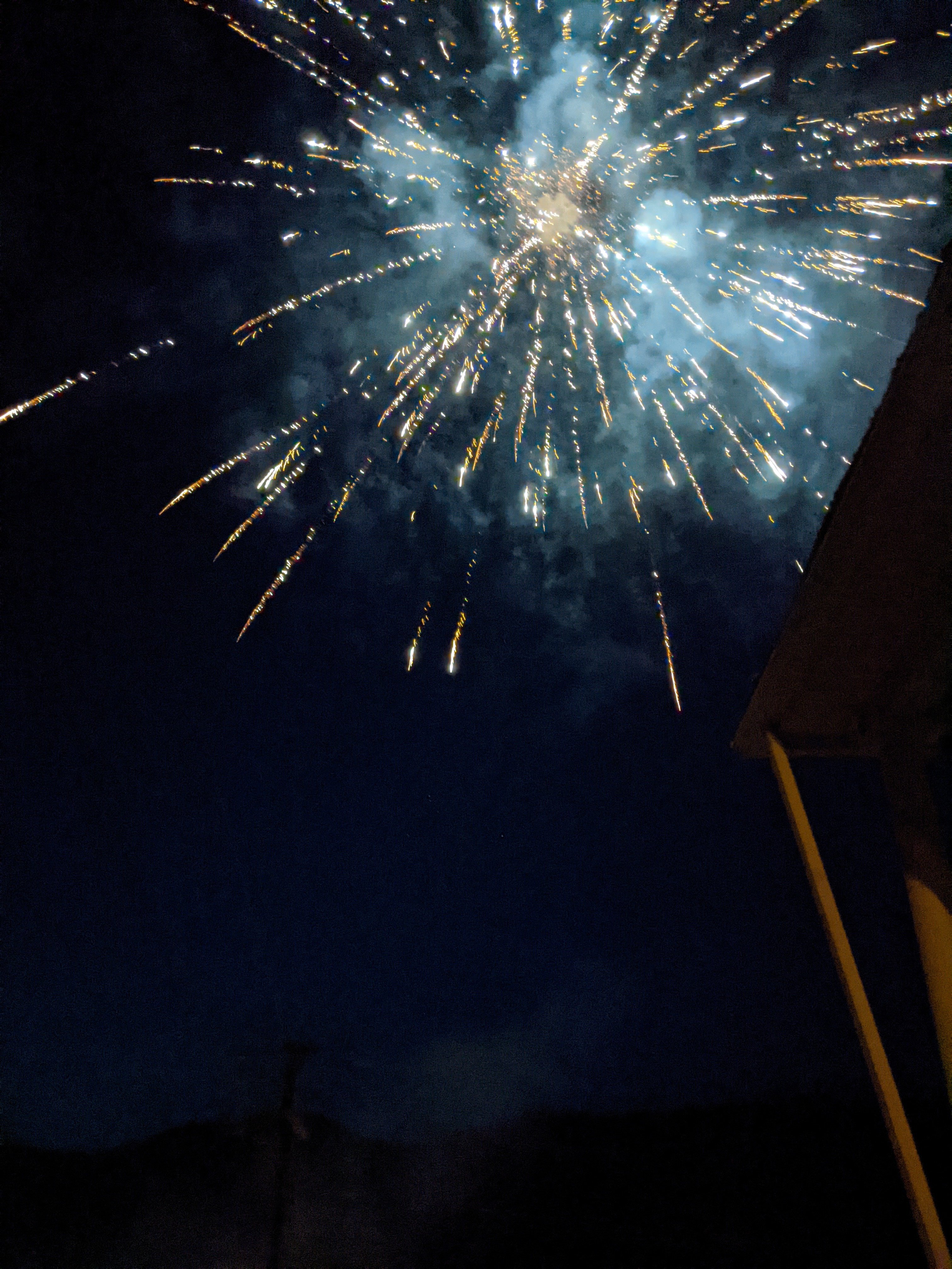 After about a half hour, we retrieved the keys. At dark we heard some fireworks in the area so Asa and I went out to watch. There were many fireworks in the surrounding area. They were pretty large for ones just being set off by people in their yards. Then we noticed out neighbor was setting up some fireworks so we decided to stay and watch those. These babies were huge. After each one, the shells would hit the roofs and people watching. Most of the people watching didn’t seem to care–some observers were as close as 10 feet to where they were being set off but Asa and I kept scooting further and further away. Nole and Esme joined us for some of the fireworks too.
