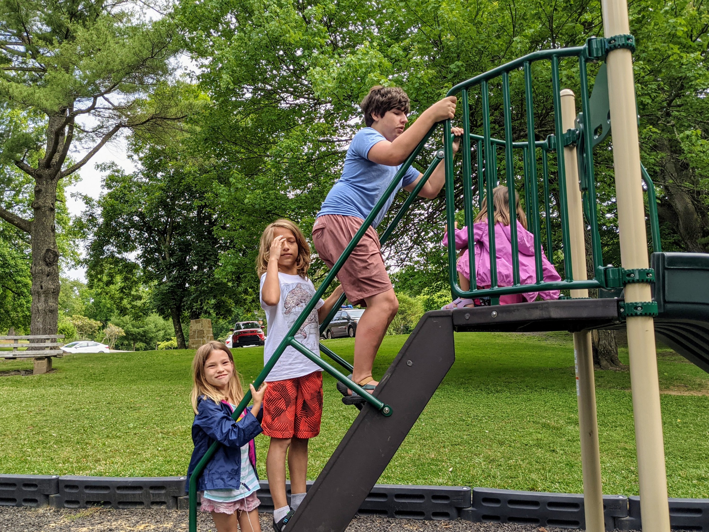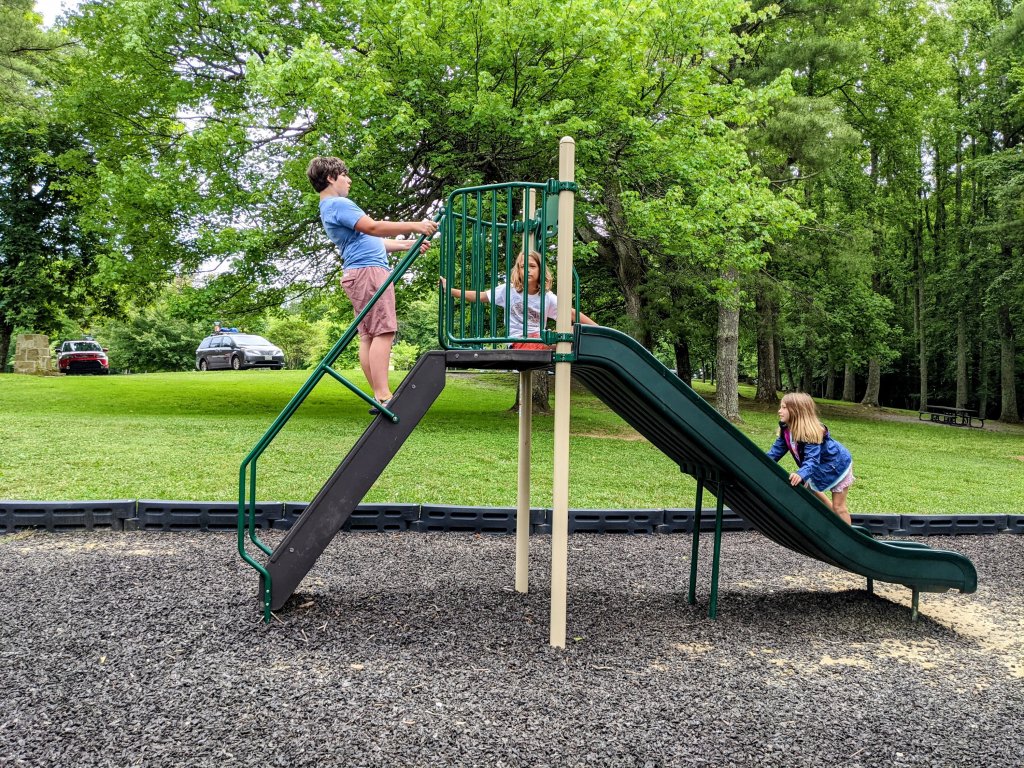 There was a playground there and we let the kids play for a while. At first the boys were playing king of the slide and not sharing. Then they invented a game where you had to answer a riddle and depending on how you answered you either went down the right or left slide (it was a double slide).