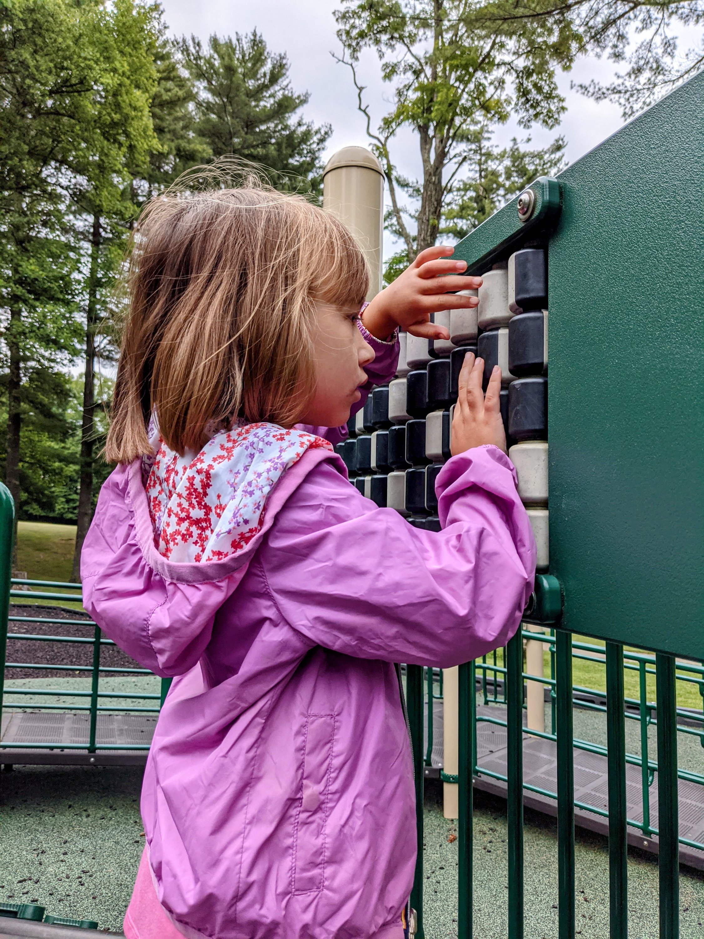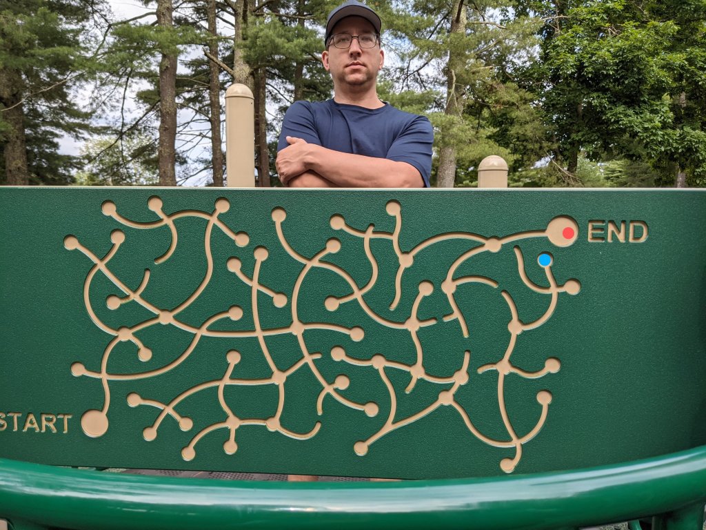 Nole noticed a similarity in this maze on the playground equipment. I added the dots. We were the blue dot trying to get to the red dot.