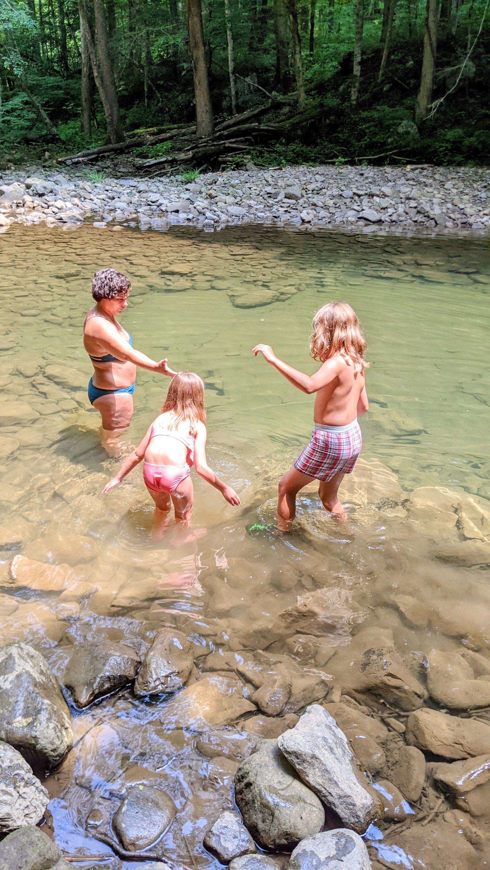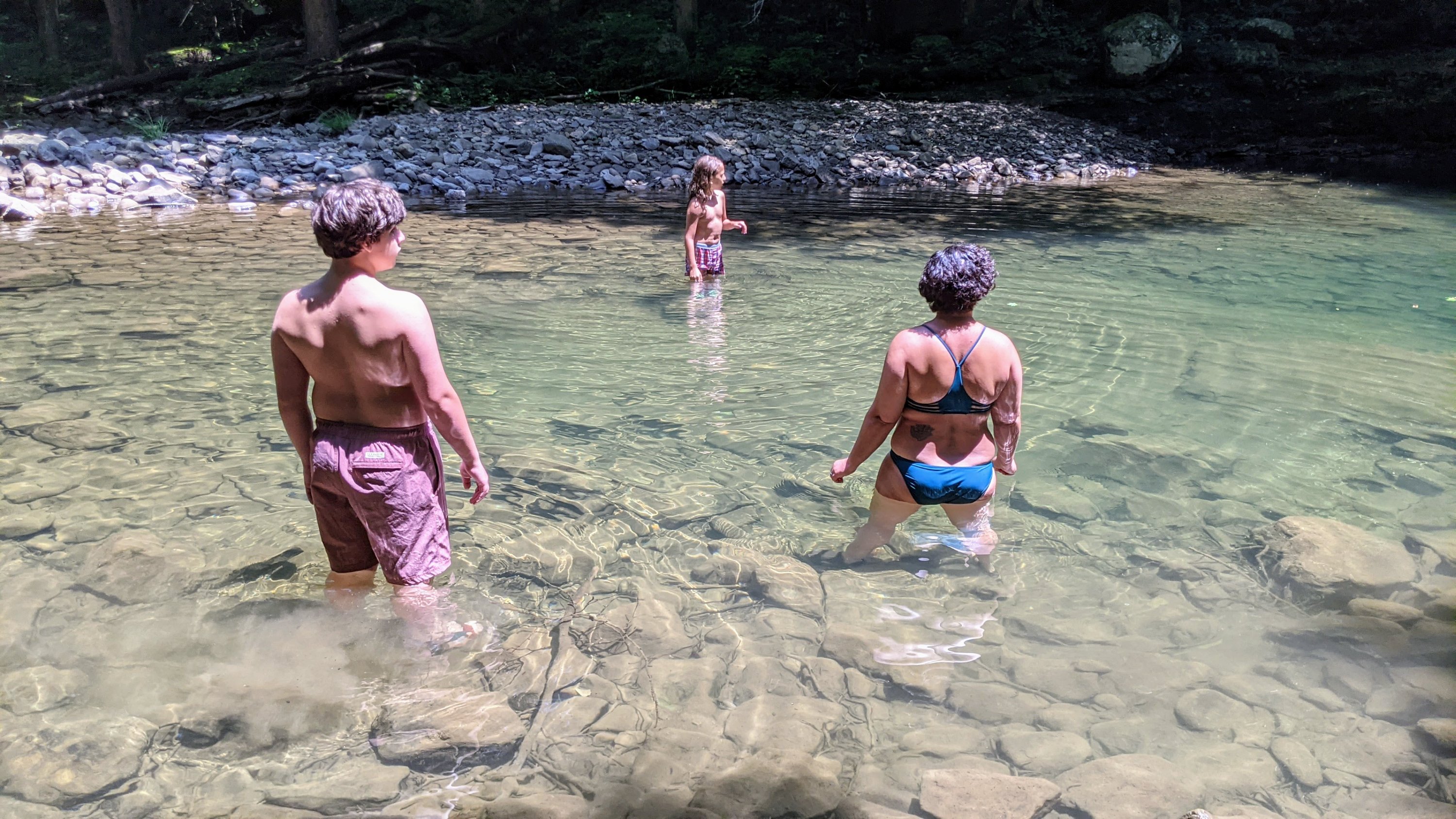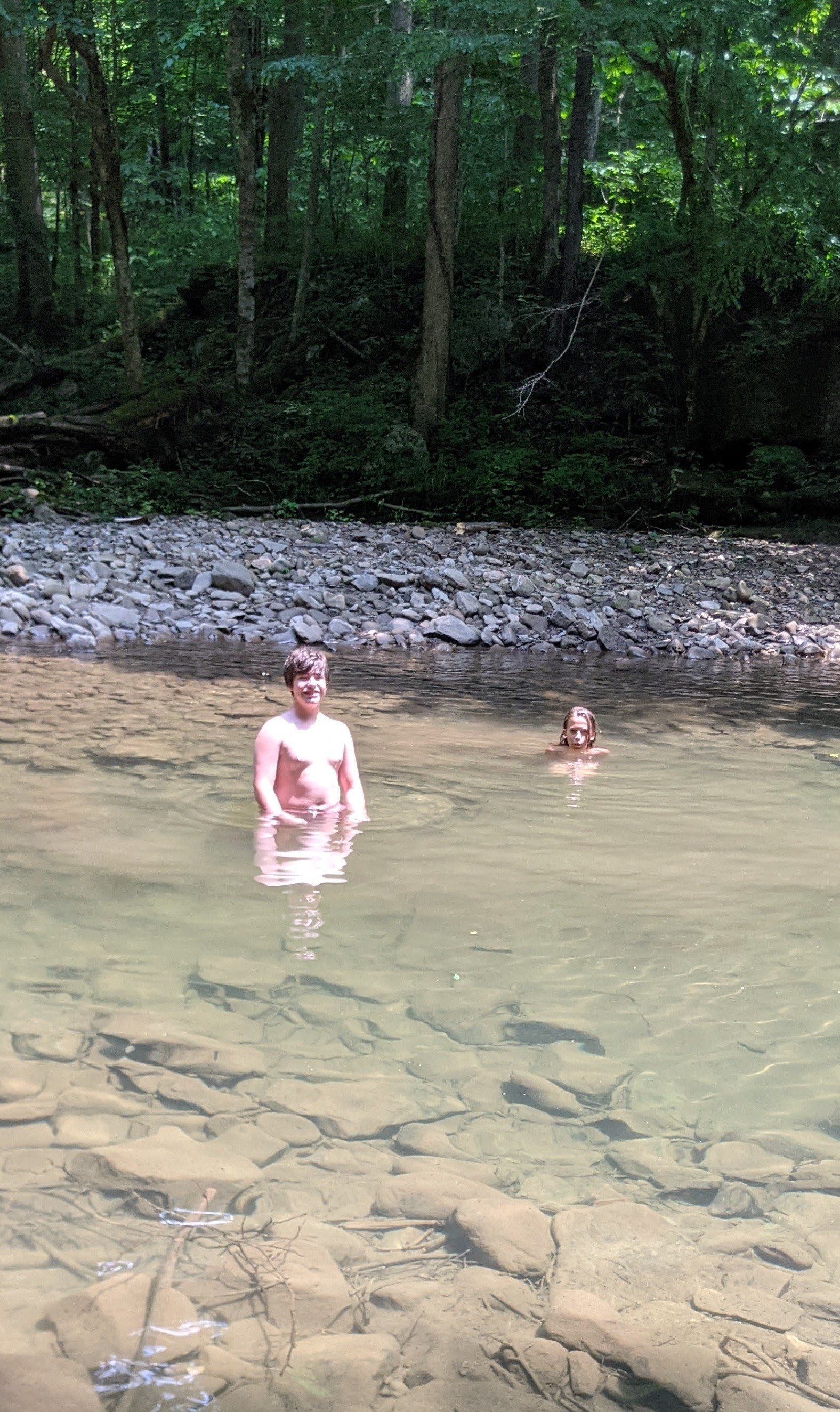 …and back across to the hiking path again. Then we continued on until we saw another path down to the creek. This one had a swimming hole in it. The water here was crystal clear and a pretty blue color. It was also ice cold but eventually Cal, Asa and I all got brave enough to go for a swim.