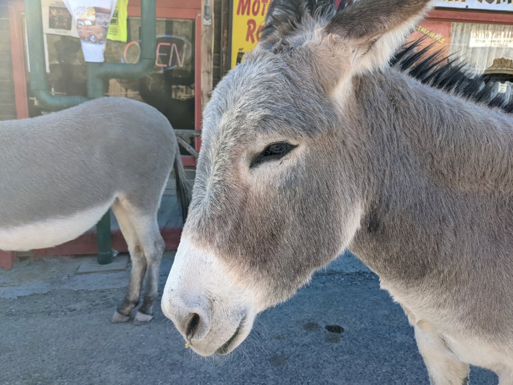 The road was winding and went through the mountains but there was almost no traffic and we got there easily. We had to stop for two wild donkeys on the road in one spot but we convinced them to move without having to get out of the RV. Once in Oatman we met more donkeys, or burros or asses as they call them.