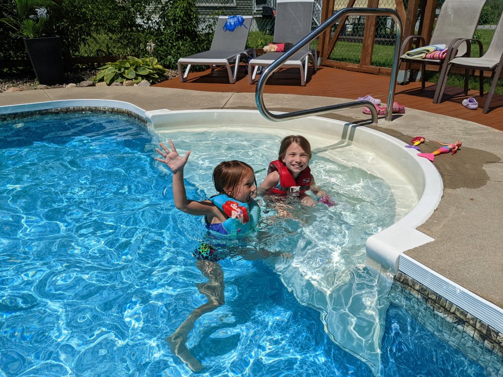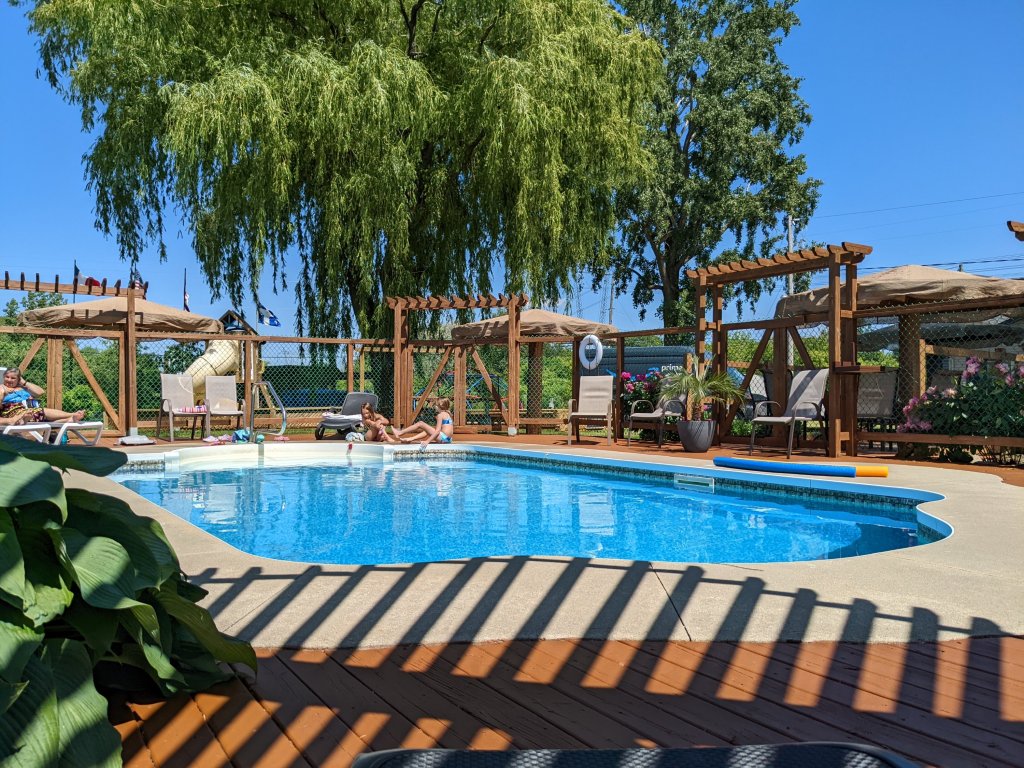 We only had about a 2.5 hour drive from Ottawa to Montreal today. We were kind of undecided whether we would get an early start or a late start so we decided on a medium start and left around 9:30am. Today was my first time hooking up and towing the camper without Nole and it went fine. I had the kids help me. I think it will get easier and easier once all the kids know their jobs. This time it took us about a half hour to leave once we started getting ready. When we got to Montreal, it only took us about 15 minutes to set up. After eating a quick lunch, we hit the pool.