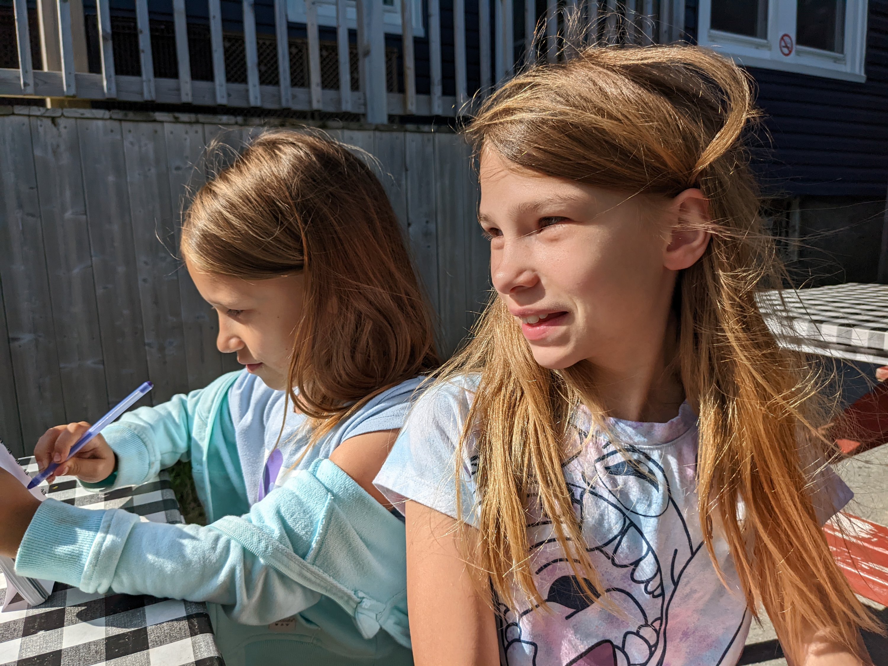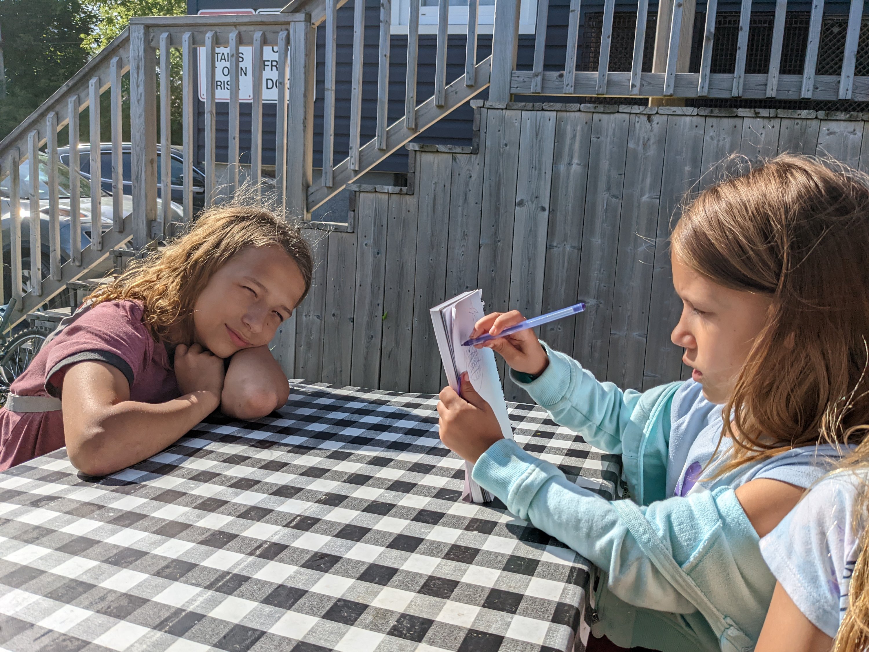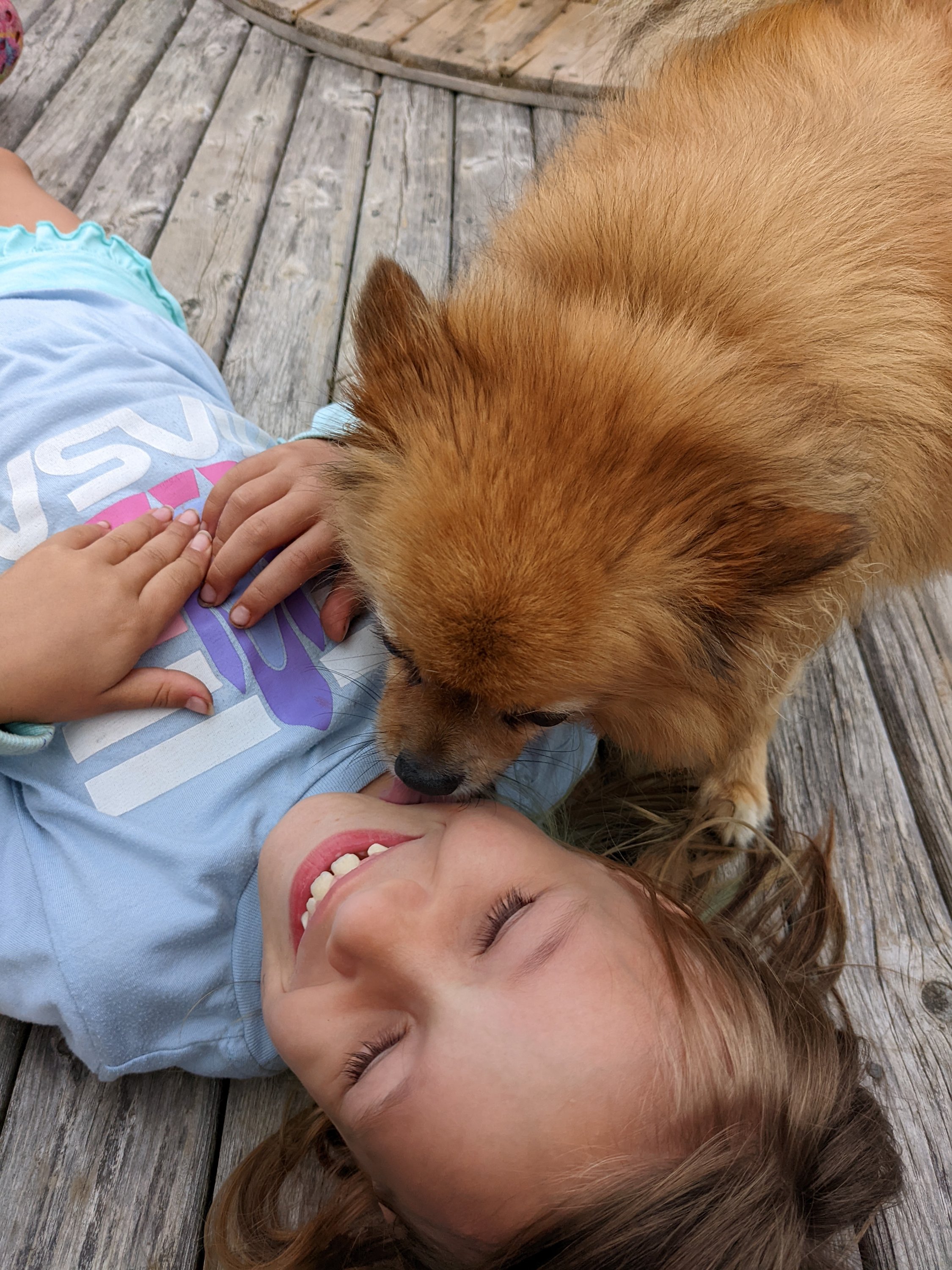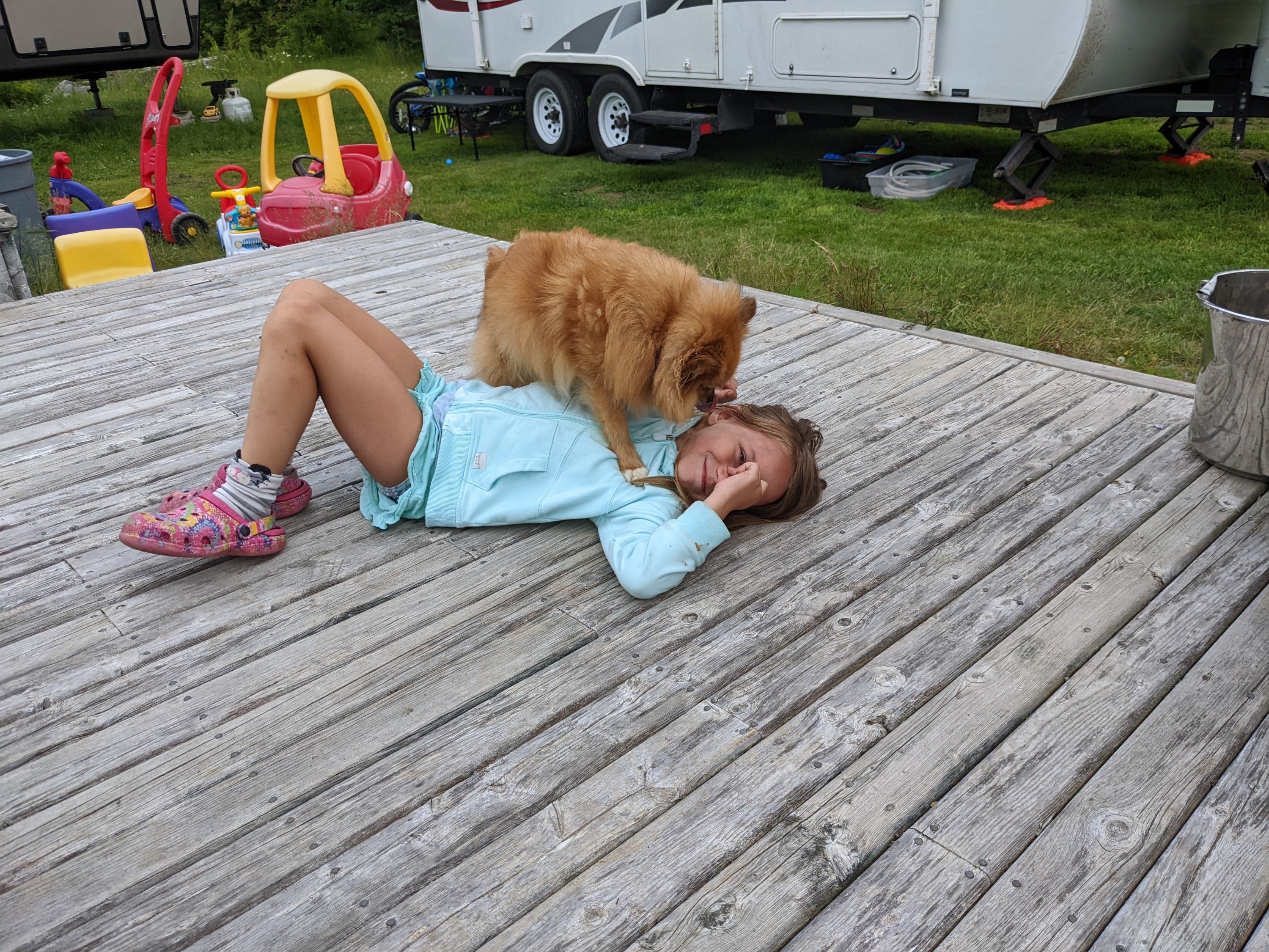 When we got back to the campsite we played some games and had a fire. Our hosts joined us for some conversation. Nova and the other kids loved playing with the dogs. She drew those two pictures of the dogs. Odin is a big brindle Boxer but I must not have gotten a picture of him. Kayle is a Pomeranian.
