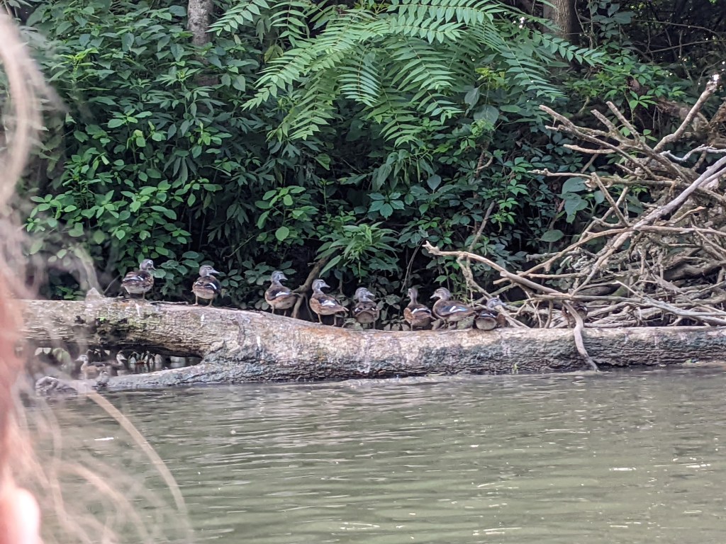 We saw a family of ducks. We also saw a blue heron really close up when it flew off of a log nearby.
