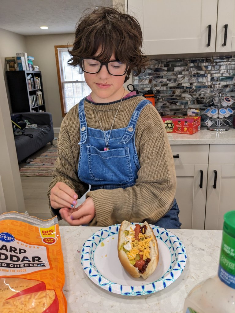 Finally, all the kids were awake and I made hot dogs for lunch. I was told Melissa never makes hot dogs this fancy (i.e. made on the stove instead of the microwave). It doesn’t take a lot to impress some people. B
