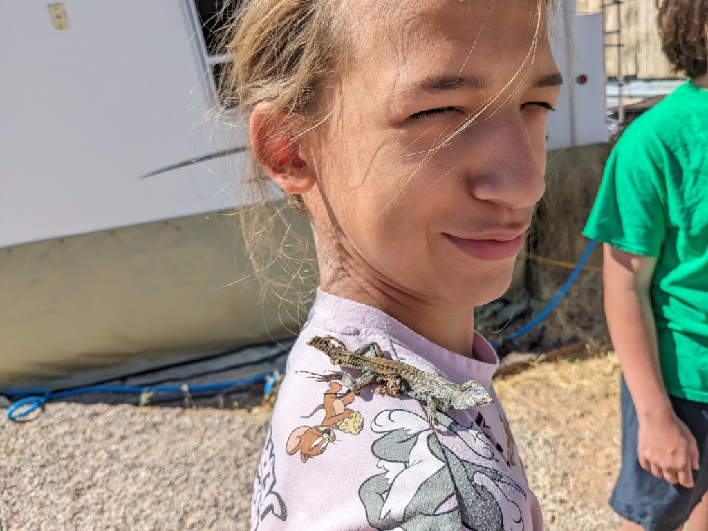It was about 7am at that time and Nole and I started calling local businesses that might offer welding. In the end, we decided to pack up the camper and drive it into town to see who could help us. We said heartfelt goodbyes to the Yatzecks who head to Grand Canyon today. Joey gave Asa this (pumice?) rock he has been carrying around as a parting gift. They made an agreement that Asa would throw it in the Grand Canyon when we go there.