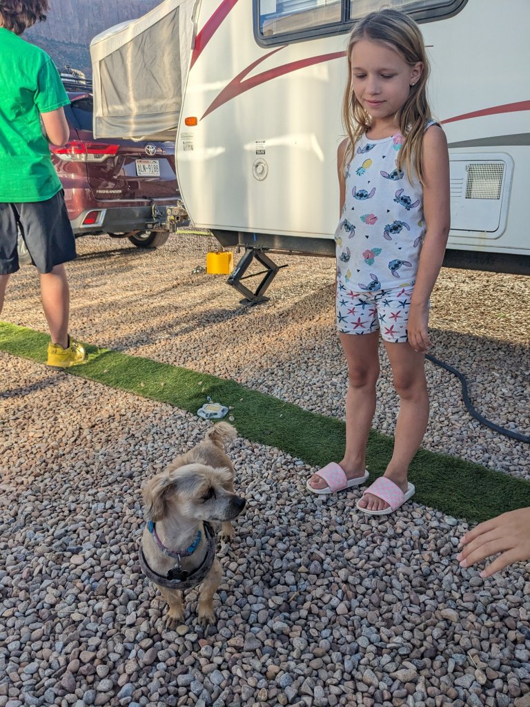 Them we stopped at the grocery store to get food for dinner and went home to make said dinner. It was heat and eat pulled pork on buns. Delish! The campground owner’s dogs paid us a visit which the kids loved. Prince is the one with the short haircut. The other one is Princess Kate.