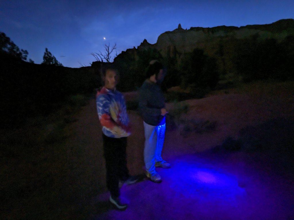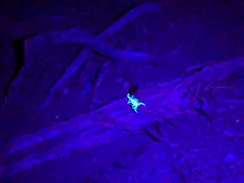Last night we went out with a blacklight I brought from home to look for scorpions. The visitor center staff at the campground told us to check the Nature Trail. We were not disappointed. Cal and Asa lead the way and did most of the searching. Nole brought up the rear with a regular flashlight and found some beetles. We even saw a beetle and scorpion together. The girls stayed back–bugs are not their cup of tea.
