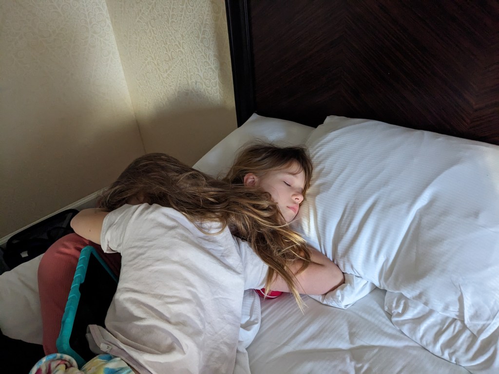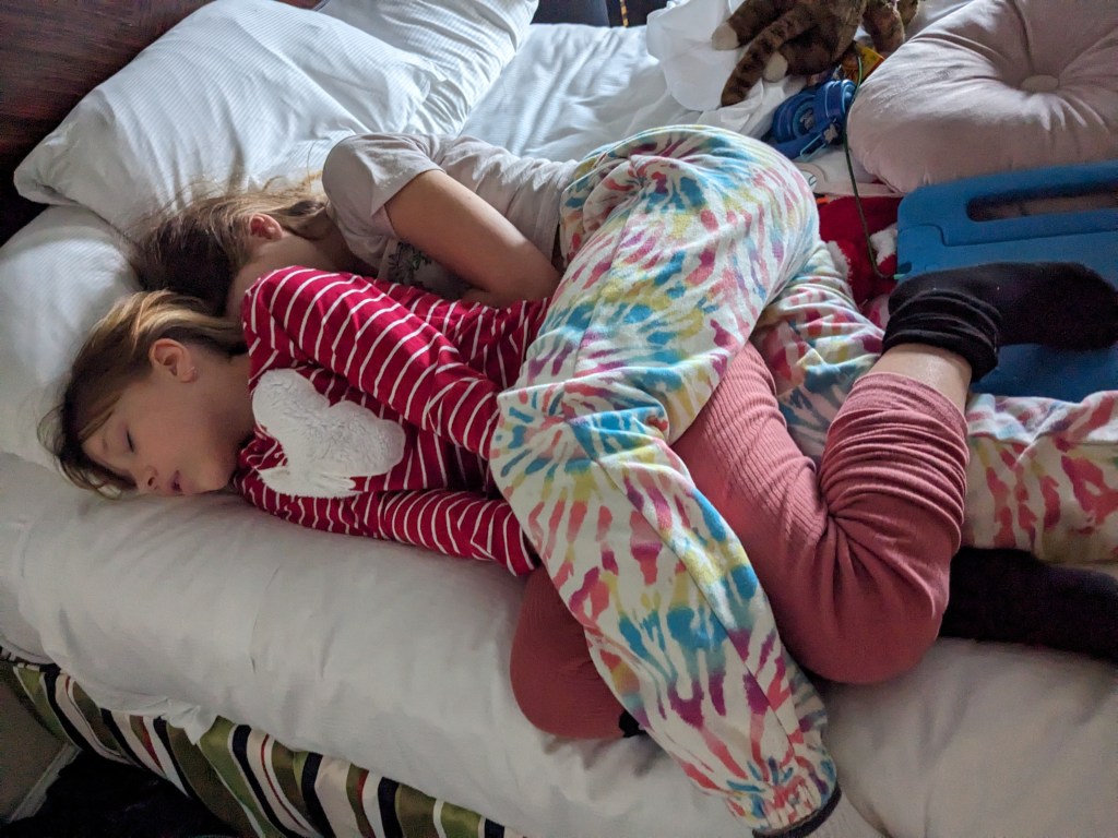 The girls slept in. They shared a full bed and Esme did not have very good bed sharing etiquette.