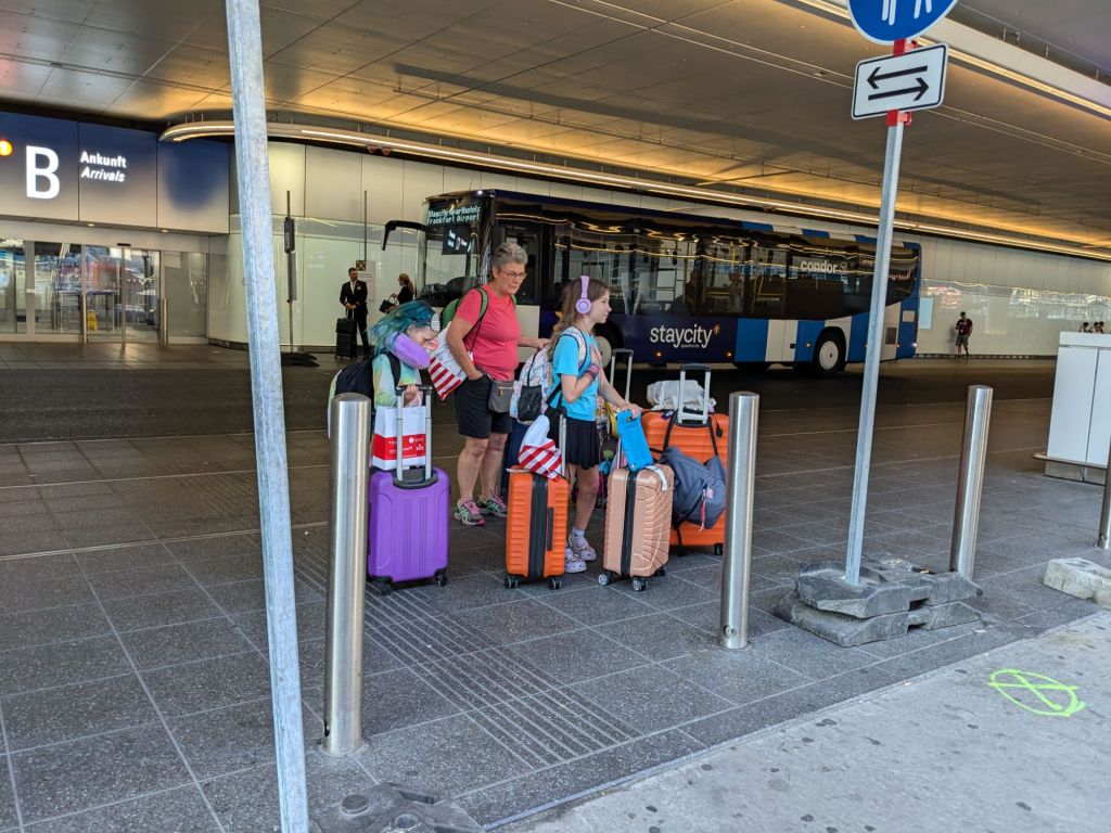Our flight left the runway late so we got in at about 6am. We did not sleep much. Esme slept on the first flight only, Nova and I slept about 2 hrs on the second flight and my mom didn’t sleep at all even though she drank her complementary champagne and I made her drink most of mine too. We flew Condor and it was a really nice experience. Candace picked us up at the airport and drove us back to her place. We will be spending a week with my sister Candace, my brother-in-law Stephan, and niece and nephew: Ruby, and Jasper.