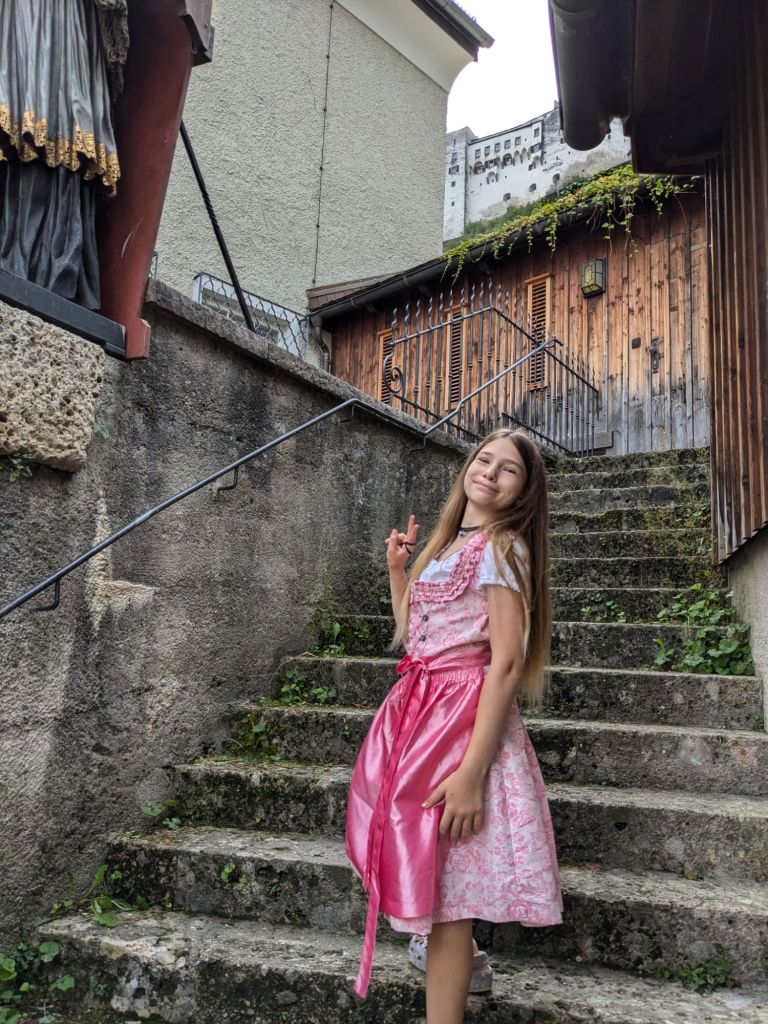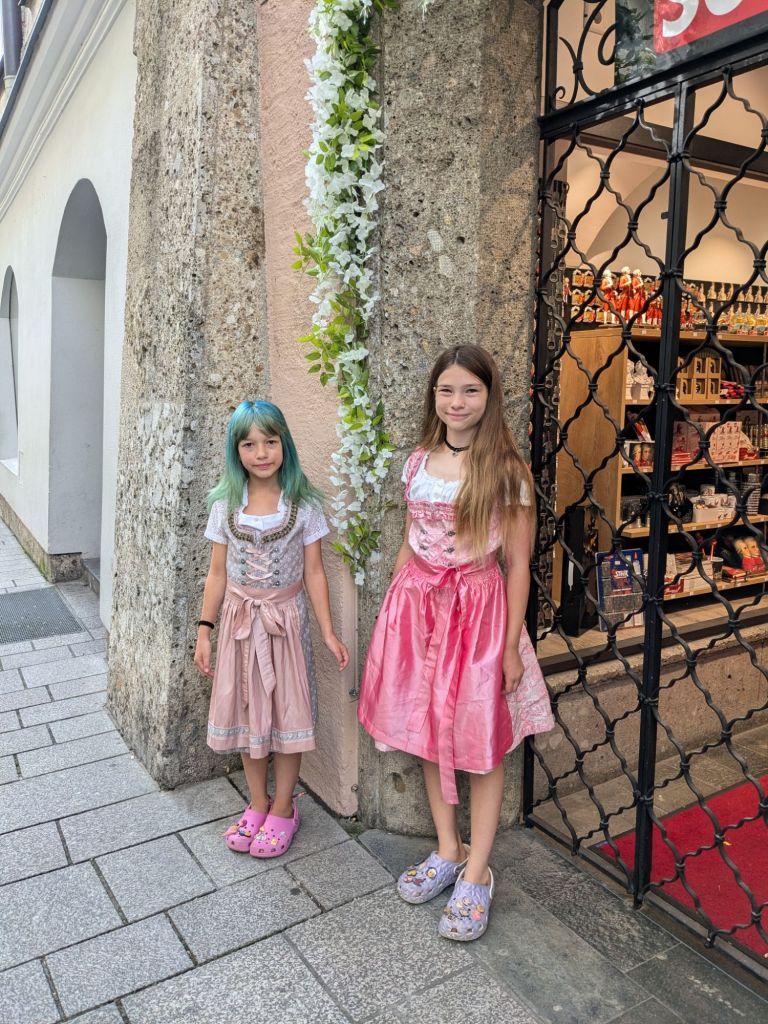 Yesterday, only Nova wanted to wear the curtain clothes and today only Esme did. We compromised that they would both wear their new dirndls this morning while we toured some sites from the film and stop home to change around lunch time.