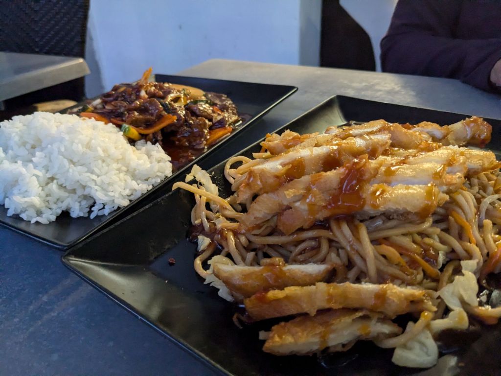 I made chicken and pasta for the girls and my mom and I decided we would go out for dinner. I’m getting sick of kids’ food and wanted something different tonight. I wore my lederhosen sweats, the girls came along for the company, and we ate bugogi and “crispy chicken” over pan noodles. The girls wanted ice cream so we got some of that on the way home. Esme led us home – she has a great sense of direction and already knows her way around the neighborhood.