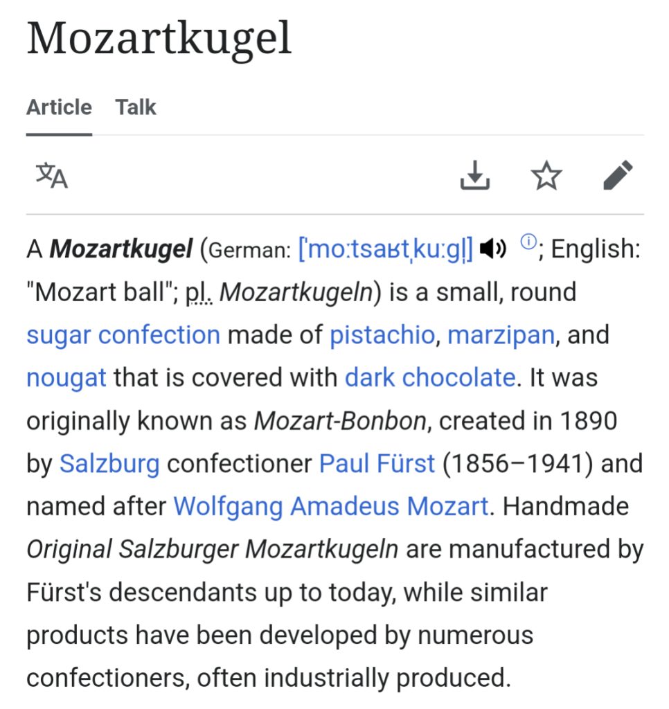 There is a confection that is sold in Salzburg called Mozartkugel which translates to “Mozart bullet” but I swear someone told me they’re called Mozart Balls so that’s what I have been calling them. We bought some and I’m the only one who will eat them. This just in… Wikipedia confirms it, they are called Mozart Balls!
