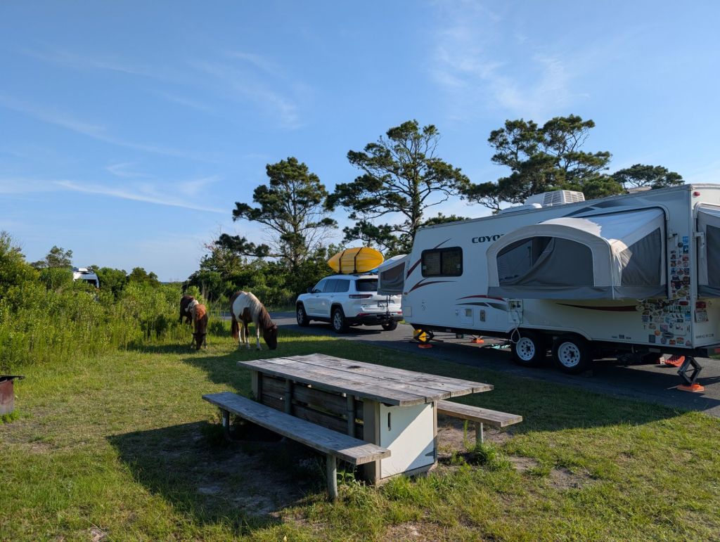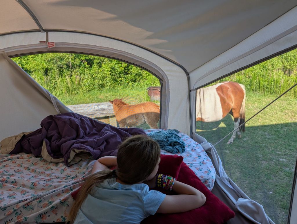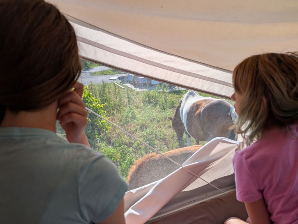 We tried to get up and moving early but the heat made it hard to get the kids going. Eventually everyone was up and packing up their things. It was only 8 am but it was about 83 degrees. While we were packing, some horses visited us. They were super close to our camper so it was like we had a viewing chamber to see them up close!