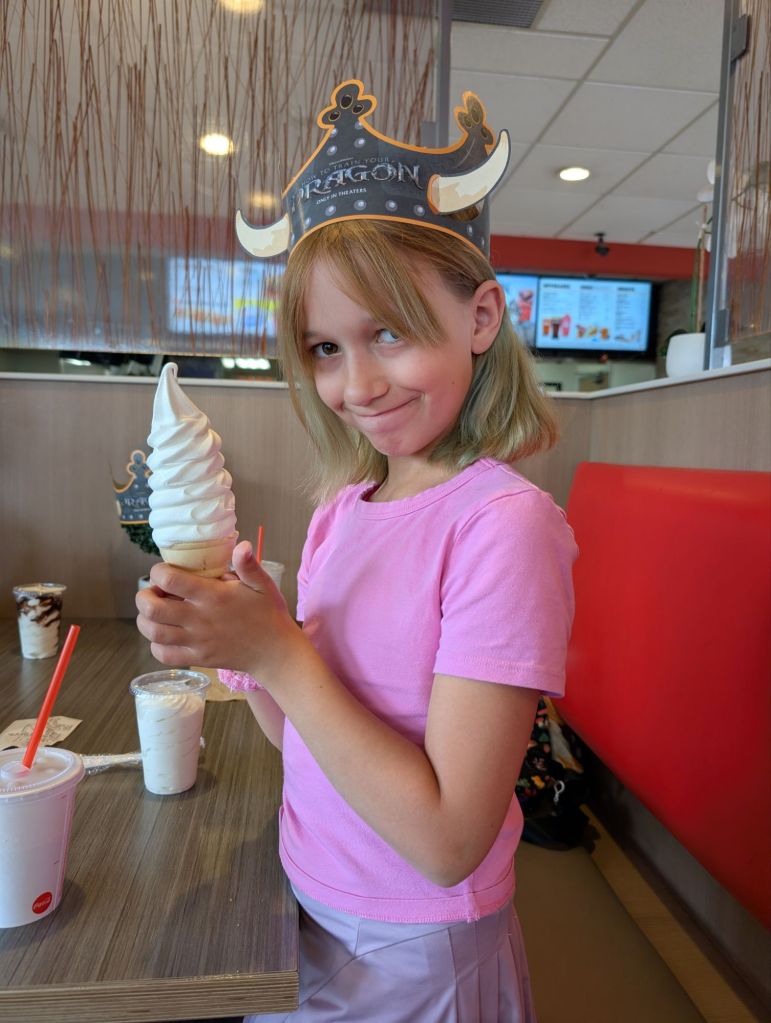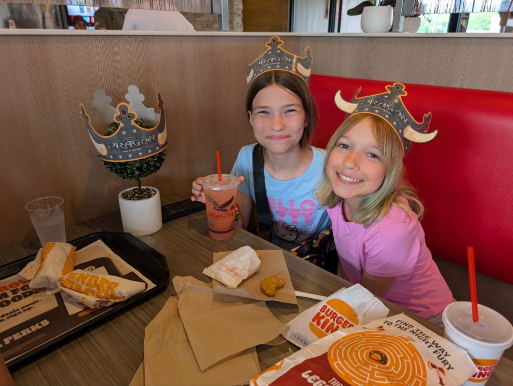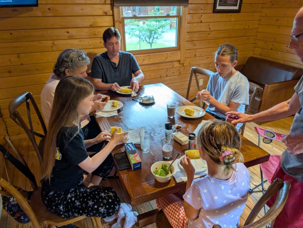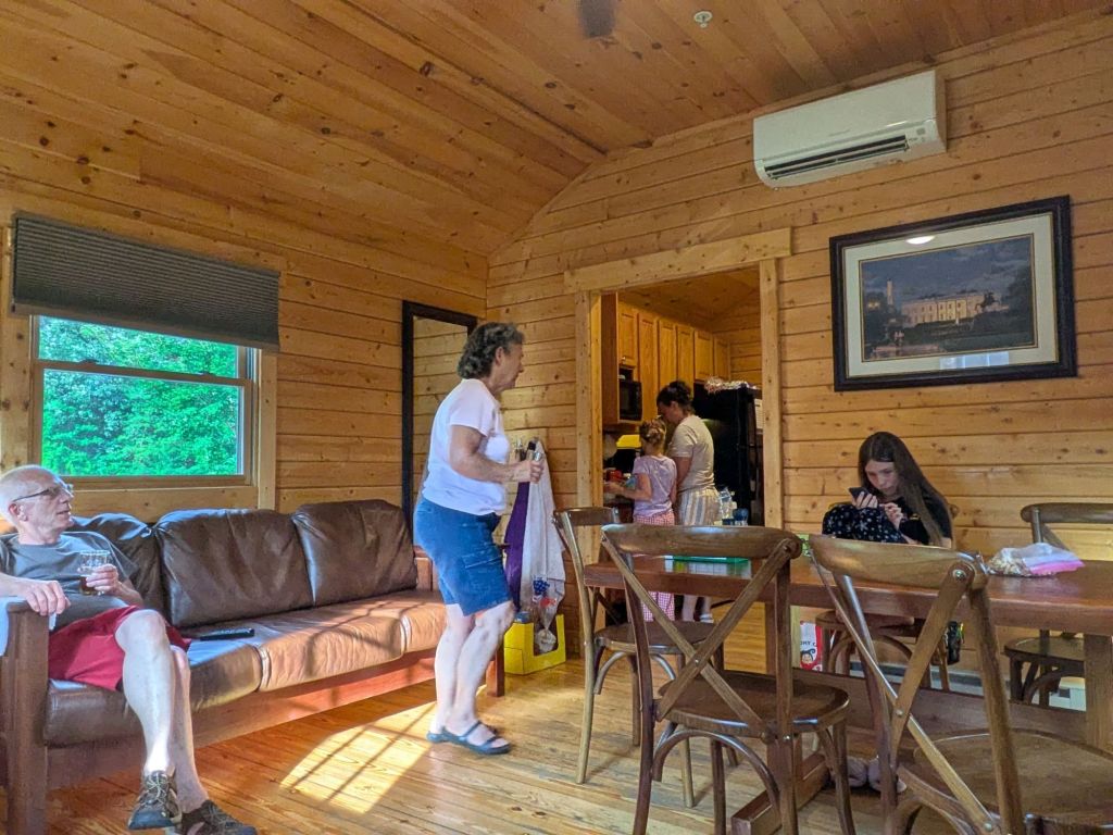 Next on the agenda was showers and groceries. We had shopped not that long ago so we just needed two meals and a couple of other items to get through the week. We brought all of our groceries from the camper to the full-sized fridge in the cabin to keep all the food in a central location for cooking. The cabin also has a table large enough for the whole group. Oh and did I mention the air conditioning? The camper has air conditioning but it has a hard time keeping up when it’s this hot.