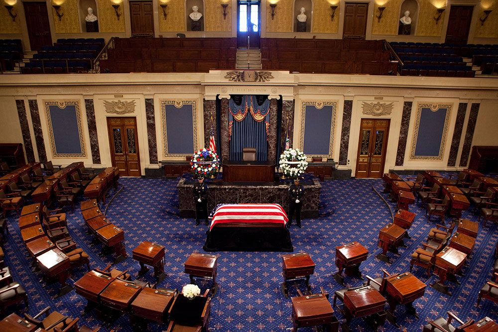 No phones are allowed inside but here is what it looks like from the gallery. Photos inside the Senate chamber are rare, this one is from 2010 of Senator Byrd lying in state. The last photo taken before this by the media was in 1961!