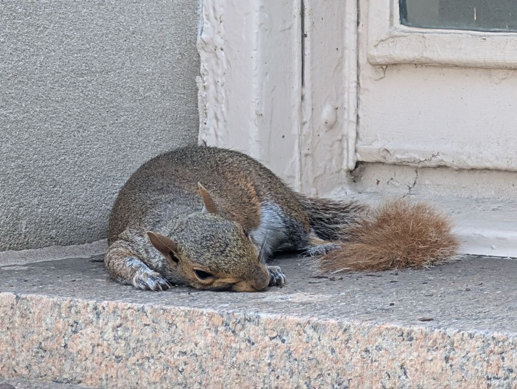 First, we saw this squirrel “splooting” on a window sill (or so we told the kids because it actually appeared to be dead). Much to my surprise, the squirrel got up and walked away shortly after this picture was taken.