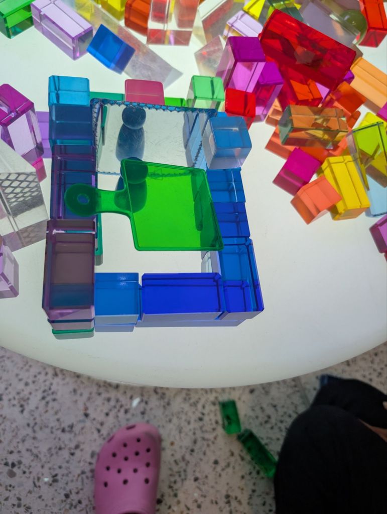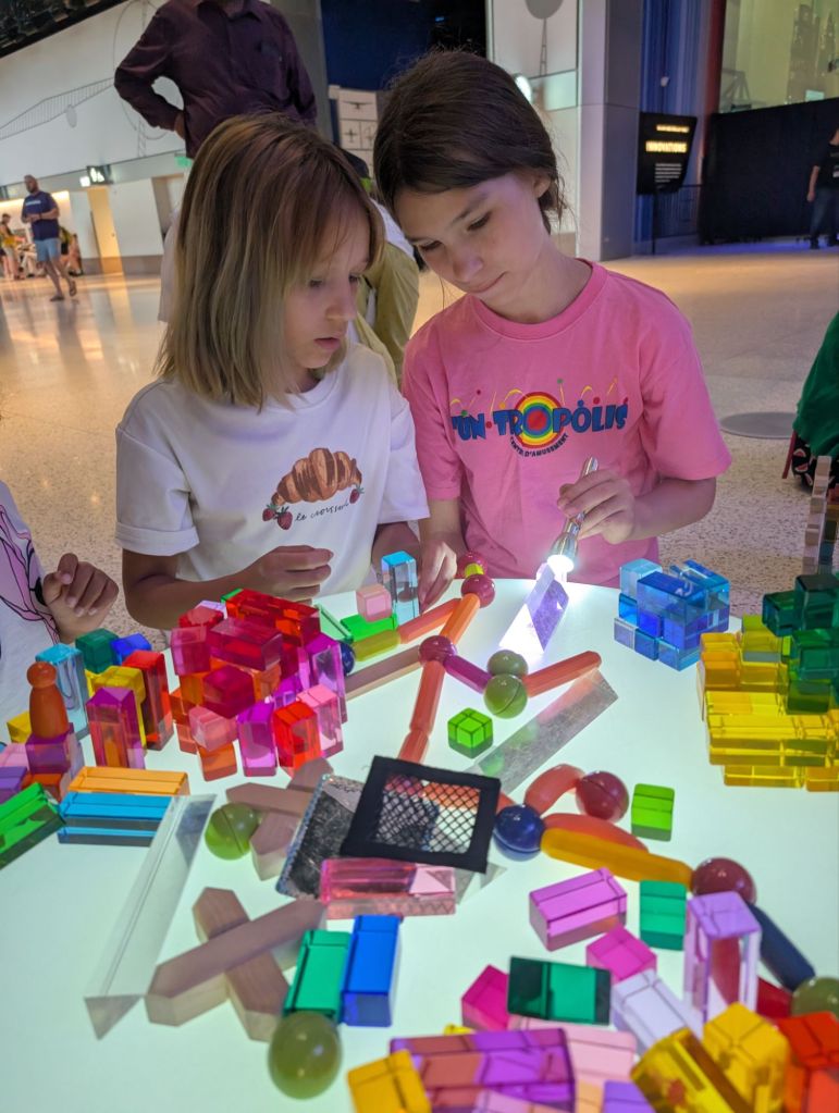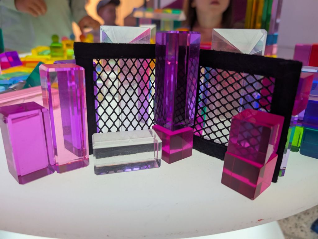 Another interpretive area where they had several manipulatives kids could play with having to do with colored, light, and shadow. The girls liked these gem blocks and played here until I dragged them away.