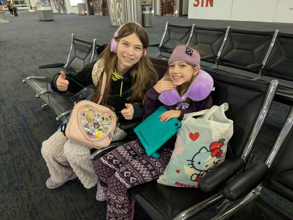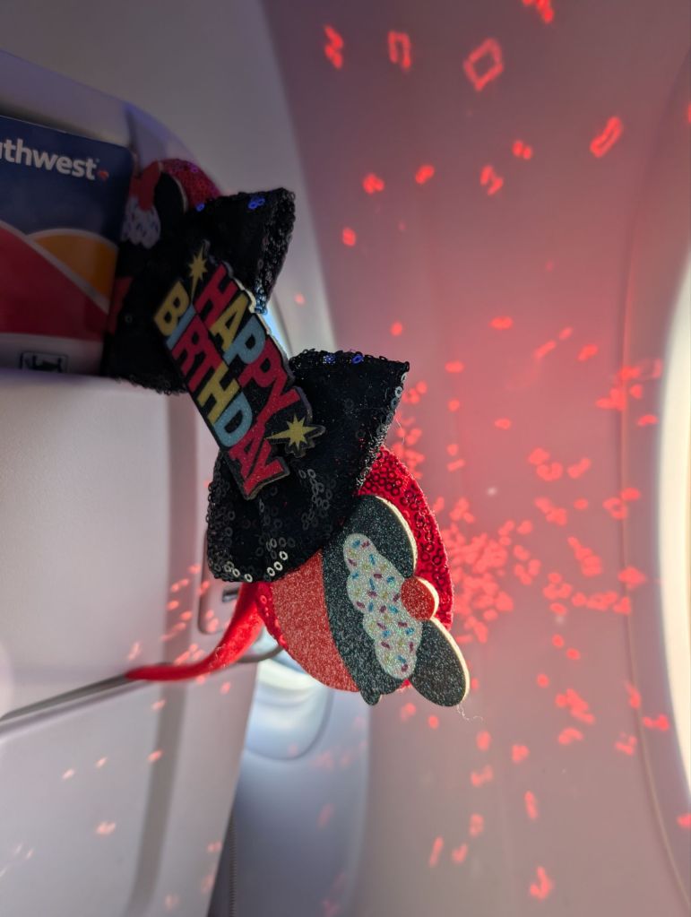 We napped a little on the plane. I wore some Happy Birthday ears (today’s my birthday!) and the flight crew wished me happy birthday over the speaker and gave me a bag of goodies on the way off the plane. We got breakfast at the airport. It was only 10am!