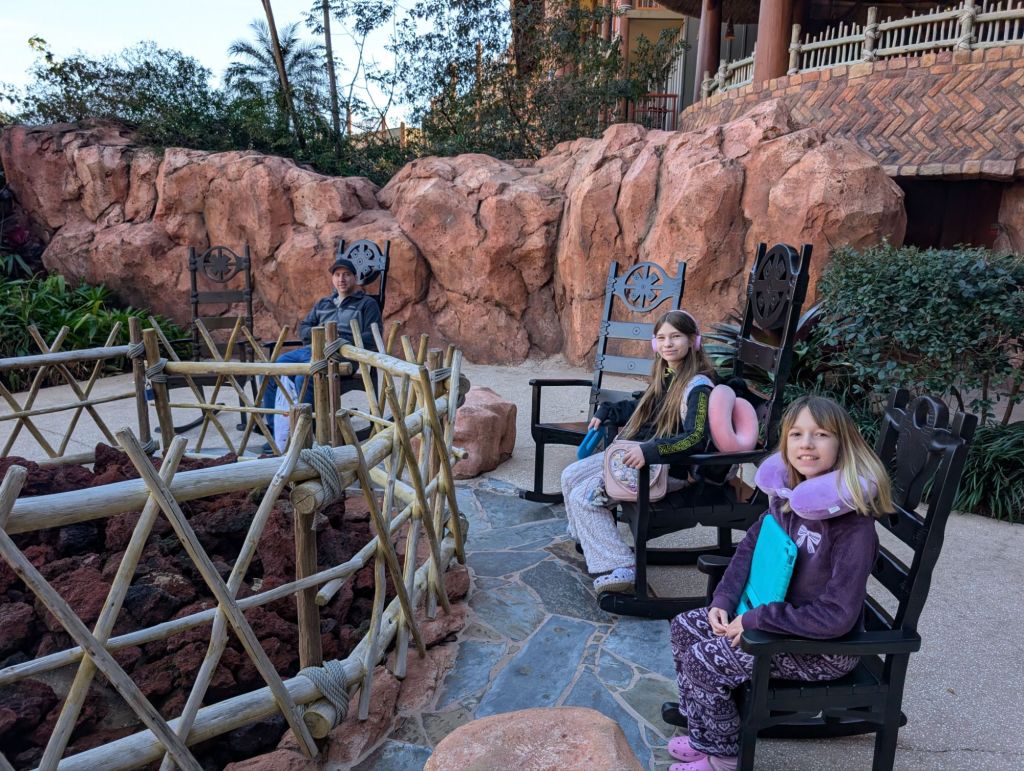 I asked Gemini AI what we should do with the time we had today. One suggestion was to go to the resort early and swim. It was too cold for that. Another idea was to tour some of the other resorts. We are staying at All Star Music, one of the budget resorts. Animal Kingdom Lodge is a deluxe level resort. It was beautiful. They have giraffes, flamingos, and other animals on the property. It would be pretty cool to look out your hotel window and see a giraffe! The animals were not very active with the cold weather so after taking a look around, we took a shuttle to Hollywood Studios to ride the Skyliner which connects some of the hotels and parks.