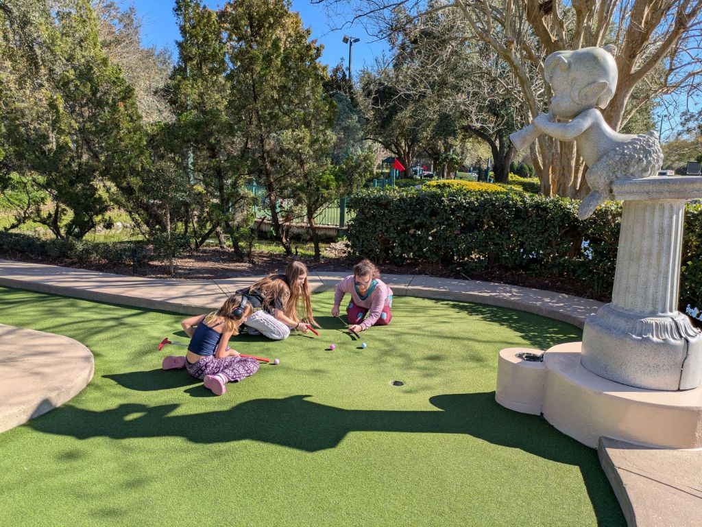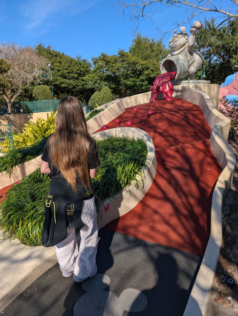 We had four free passes for mini golf so we went back on the Skyliner and to the entrance of Hollywood Studios where we took the Friendship Boat (you can’t make this stuff up!) to the Swan Hotel which is near the Fantasia themed mini golf.