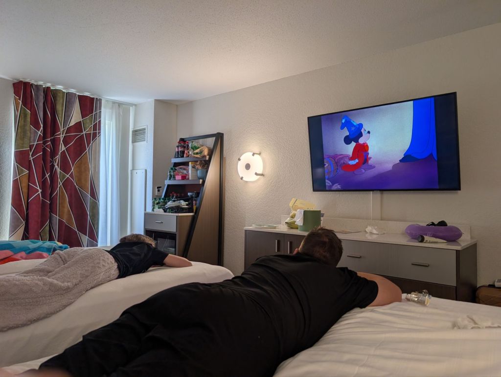 Our room was ready by the time we finished golfing so we walked back to the Hollywood Studios entrance to take a shuttle to our hotel. Our groceries were arriving right when we were and we took them to our room. Our suitcases has been transferred from the airport to our room thanks to a partnership between Southwest and Disney World. The groceries I ordered included a rotisserie chicken and a salad along with snacks, drinks, and some easy meals. We devoured the chicken. After playing Fantasia golf, I wanted to watch Fantasia so we did that…and promptly all fell asleep. I woke everyone up once Fantasia ended. Going to bed for the night at 4:45pm seemed like a bad idea!