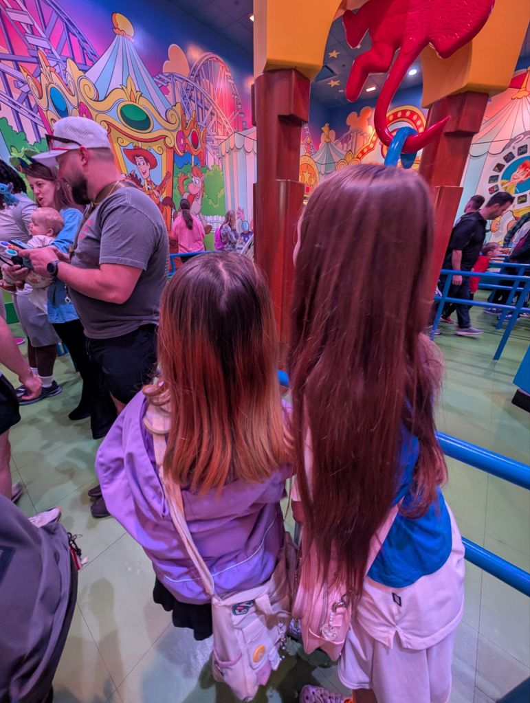 Next was the park’s Toy Story land. We skipped the spinning saucers because it’s similar to the Teacups which we can ride tomorrow. The newer Slinky Dog Dash which is a family friendly coaster. The girls were just too intimidated looking at it. Disney hides a lot of their rides from sight which helps ease some of the anxiety.