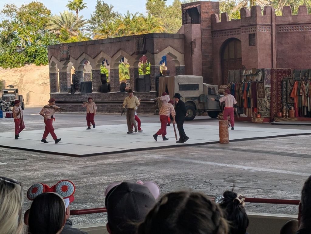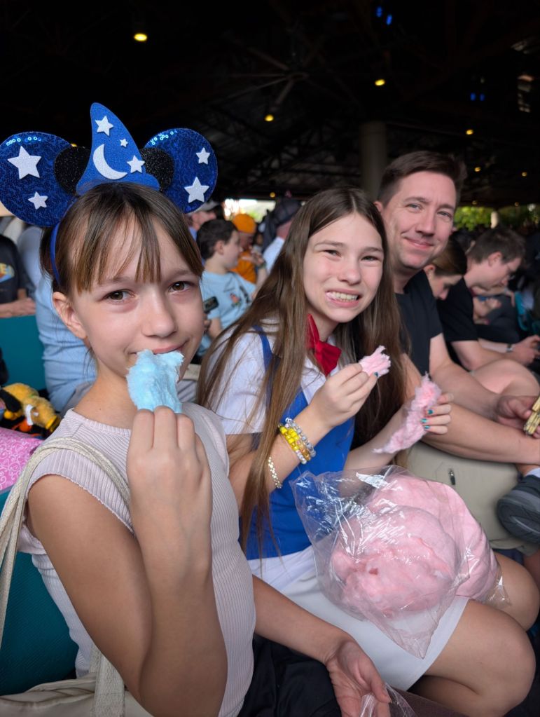 Then it was off to ride Mickey and Minnie’s Runaway Railway. It was new to us and a pretty fun ride! We went to Indiana Jones Stunt Spectacular next, I wasn’t sure the girls would like this one but they did. We also got cotton candy (only $5 a bag…the food here is more reasonable than I remember!).