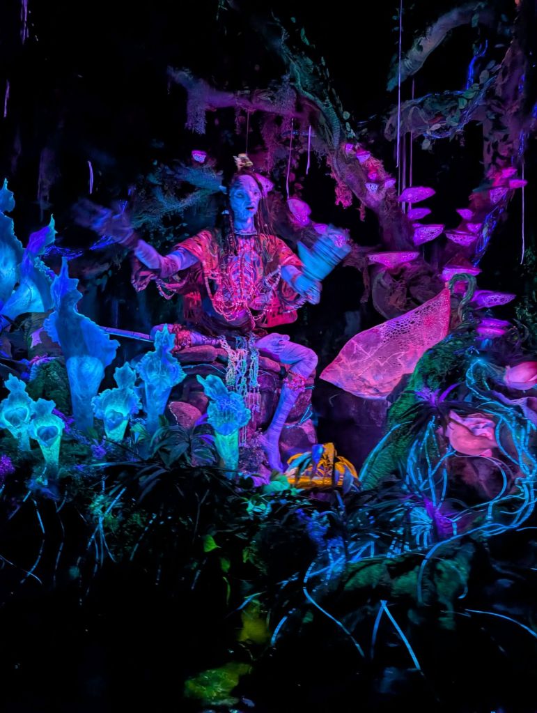 As we were walking in, they came running down the path. Rather than race them to Flight of Passage (the ride we were heading to), we went to the Na’vi River Journey which is a gentle river ride through Pandora, the land of the Avatars. It only had a 10 minute wait (it consistently had a 45+ minute wait the rest of the day).