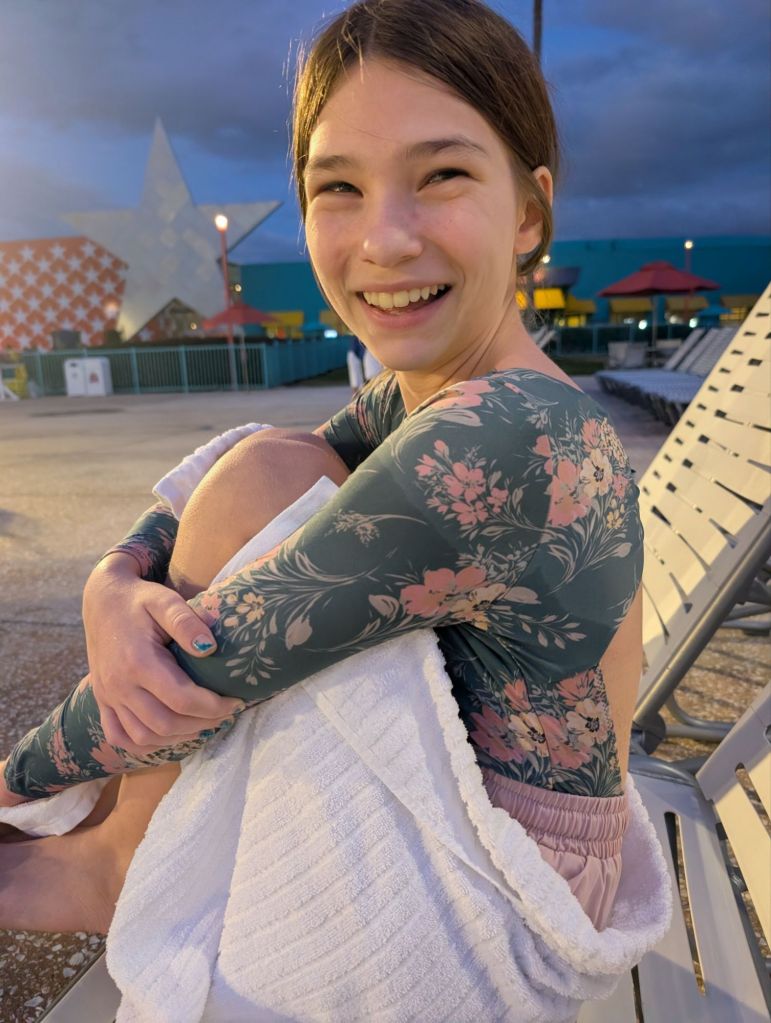 Thanks to lots of luck with wait times, we had enough time to do more – it was only about 4–but we decided to go back to the hotel to swim. We got back and I made grilled cheese and pudgie pies for dinner. By the time we finished making them it was dark out but we went to the pool anyway. With the sun down it was too cold to swim so we will try that again on Saturday (no parks that day!).
