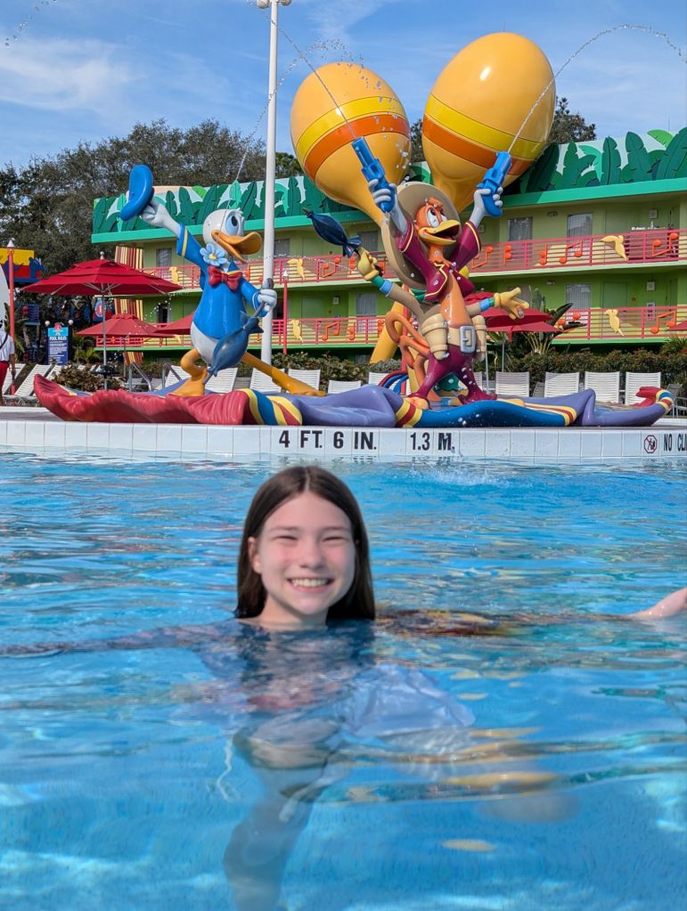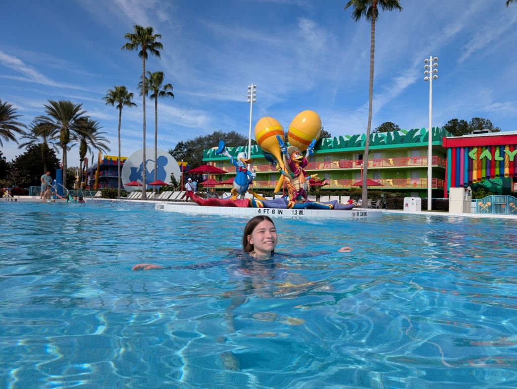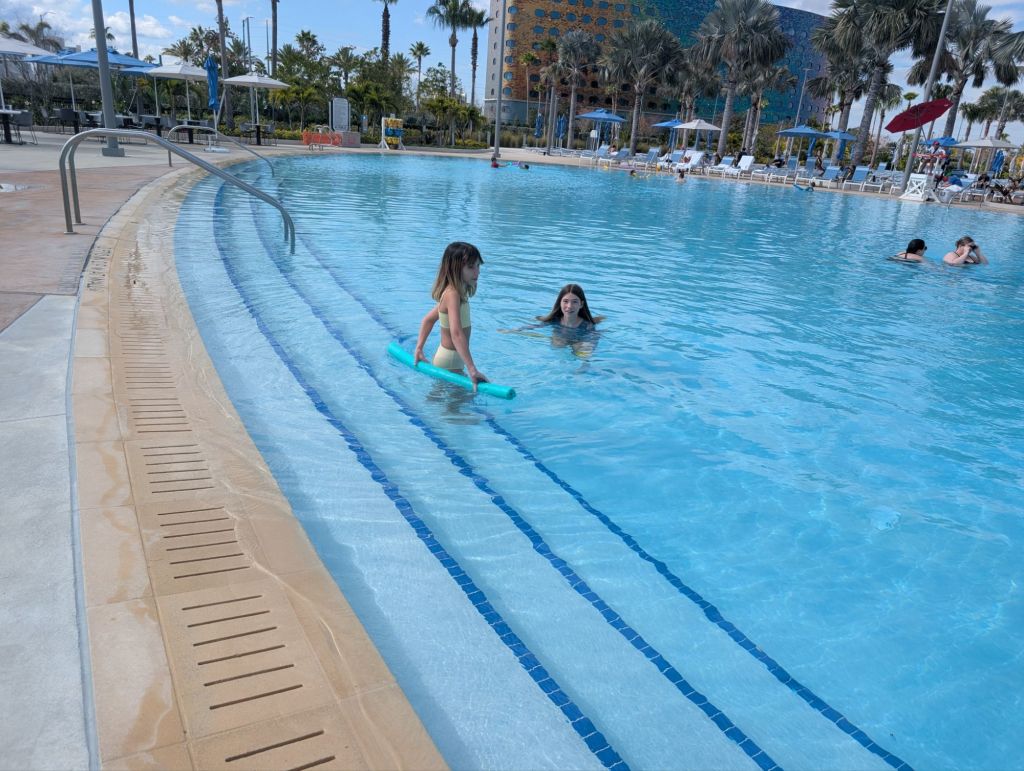 We started out the day with sleeping in a bit, eating pancakes and French toast, and packing up the room. It’s moving day! We’re leaving our Disney resort for a Universal resort. Before we left, we swam in the pool at All Star Music, our home for the past few days.