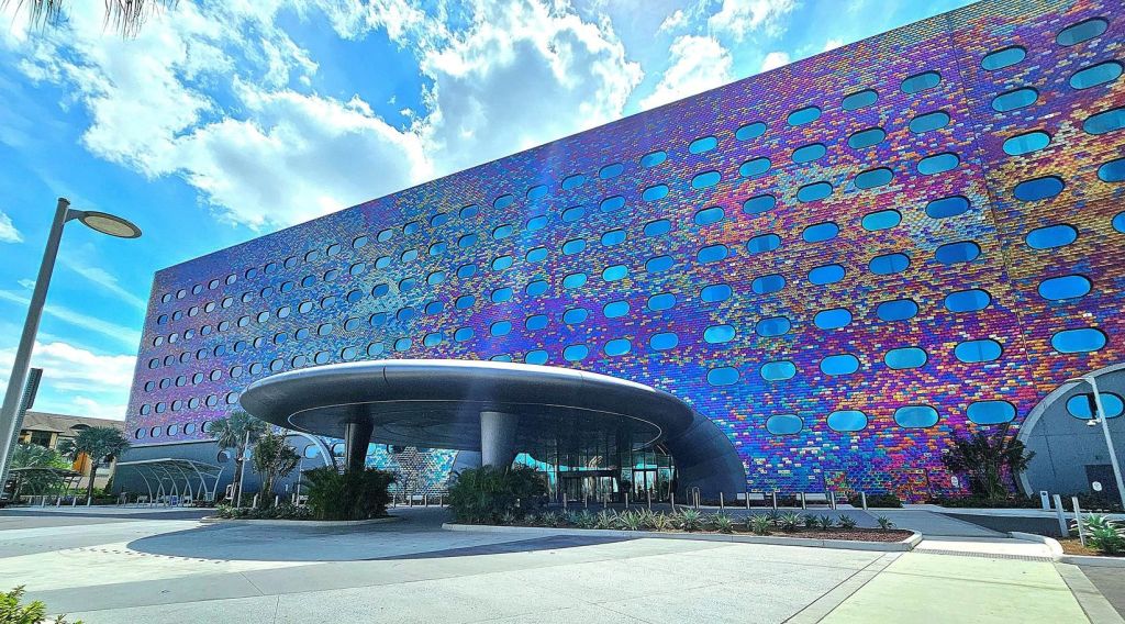 We were sad to leave our new friend but they had plans to get to today too. Nole did a little laundry while we swam and when that was finished, we grabbed lunch at the hotel. We kept our swimsuits on because after an Uber to our next hotel called Stella Nova, we hung out at their pool until our room was ready. Stella Nova is one of Universal’s new value line hotels. They opened in January of 2025. Although they have done some updates since then, All Star Music has been open since 1994. We were really wowed by the look of this hotel. Here are a couple of professional photos I found online.