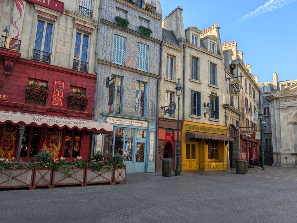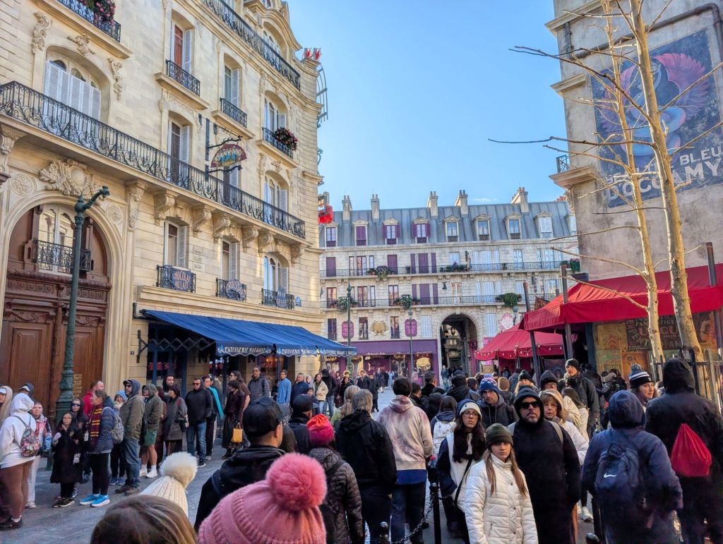 We lined up in the area to go to the Harry Potter area here which is fashioned to look like Paris.