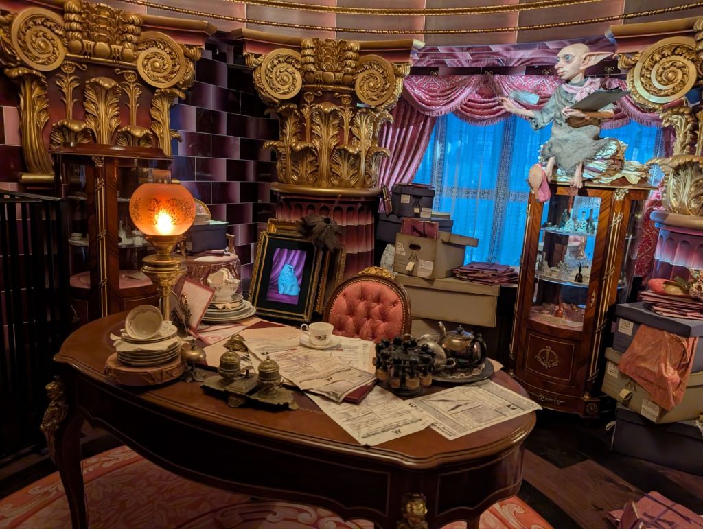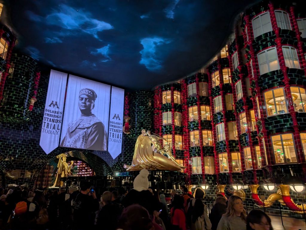 Although the ride in this area, Harry Potter and the Battle at the Ministry, was not set to open until 10, we had a feeling it opens earlier than stated. Yesterday, while we waited for the Mario Kart ride, I noticed that other rides had 120 minute plus waits even though they were not supposed to be open for another 45 minutes. Well, that was a good hunch because it was open and operating early. We boarded the ride at 9:50 am (after the few hundred people who got there before us). The queue for this ride was really amazing! All of the following photos were taken while waiting in line for the ride.