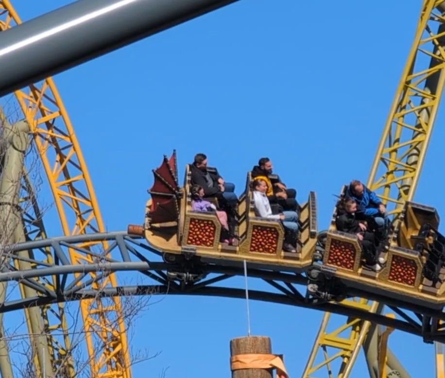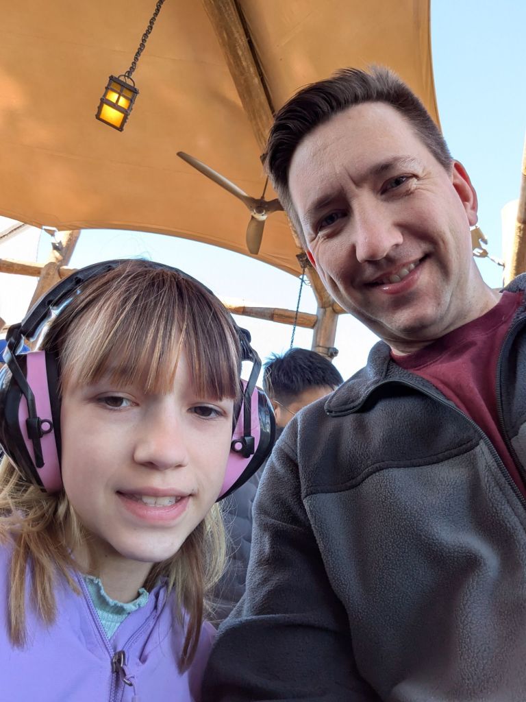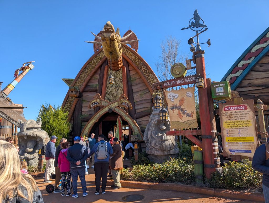 Next Nova wanted to take Nole on Hiccup’s Wing Gliders, the ride she liked so much we did it three times earlier this week. It had been marked delayed all morning but as we walked up, I noticed they were running empty “test” coasters and suggested Nole and Nova get in line. The sign was still reading “delay” but they only waited about 25 minutes. When they got off the ride, it was up to 70 minutes.