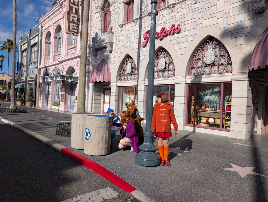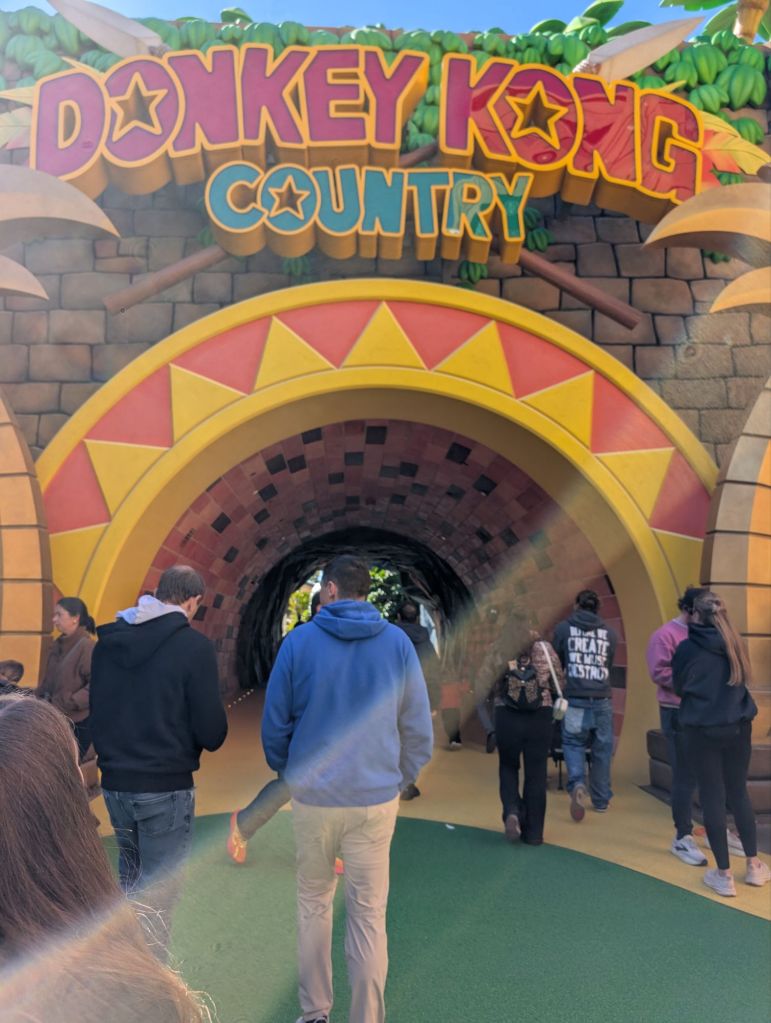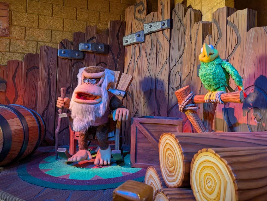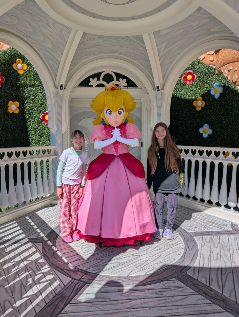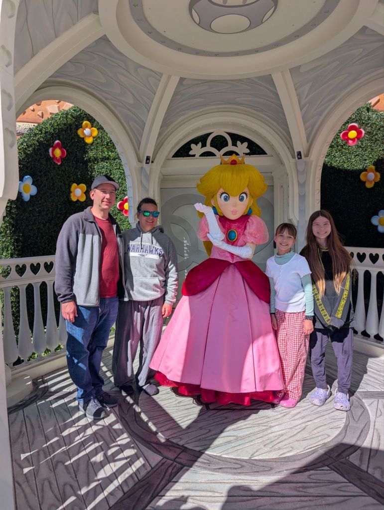 Mine-Cart Madness was still marked “delayed” so I suggested we head that way and wait nearby in case it opens. We got distracted by a queue to meet Princess Peach so we did that first. There was a staff member nearby with a tablet that was controlling the sound bites and animatronic mouth on the character, which was a costumed person controlling the rest of the character.