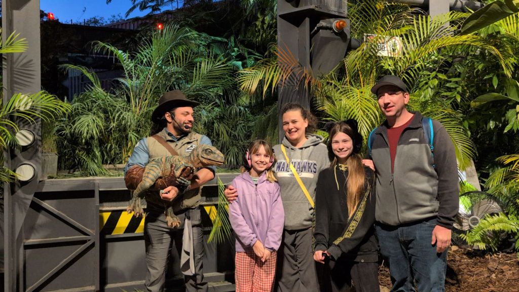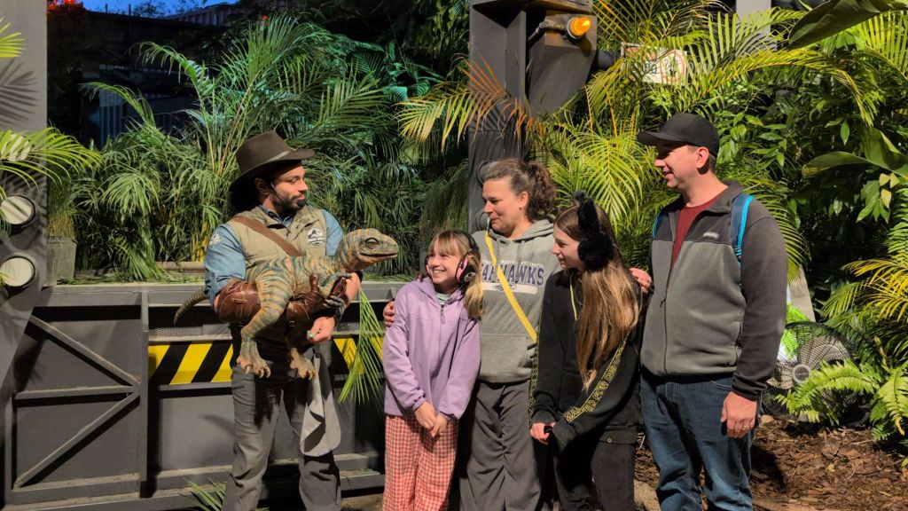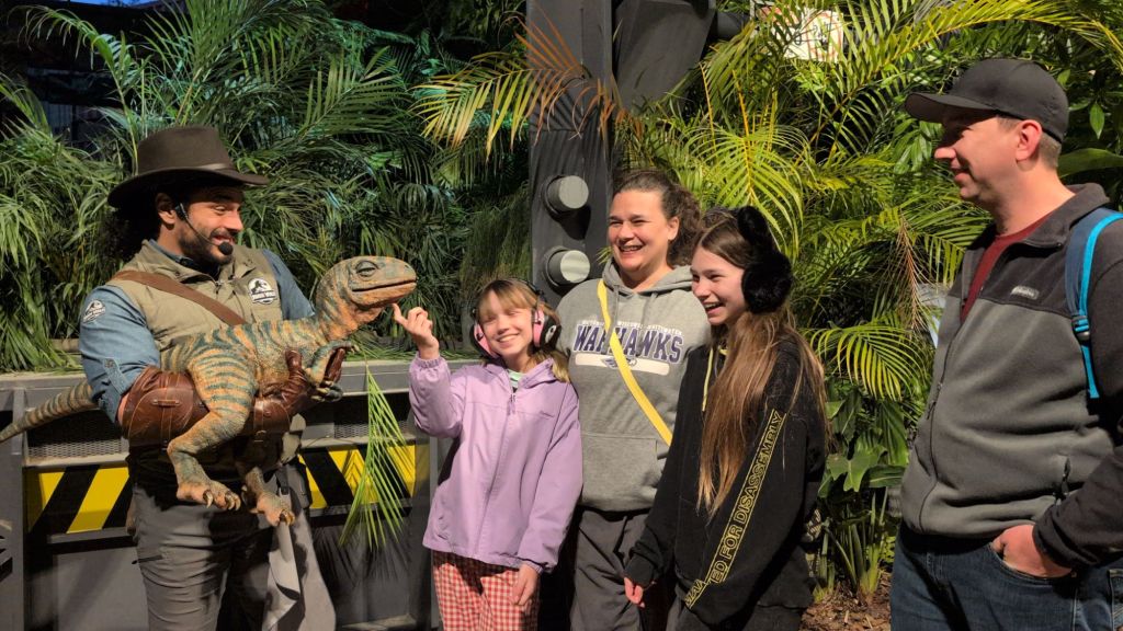 We did a little shopping in the Seuss area. Nova and I also rode Spider-Man again. We bought 4 blue cotton candy bags because hey, we’re on vacation! Then we went to Raptor Encounter where we got to meet a baby velociraptor.
